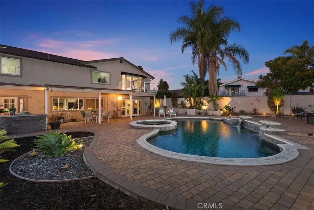 Welcome to 26872 La Sierra Drive, a beautifully upgraded home in the heart of South Mission Viejo designed for effortless indoor/outdoor entertaining and relaxed California living. This spacious 5-bedroom, 2.5-bathroom home (with potential for a downstairs bedroom and full bath conversion) sits on a rare 9,750 sq ft flat lot and features an entertainers dream backyard that feels like your own private resort. From the moment you arrive, the home impresses with a paver-lined driveway, courtyard, and backyard patio. Enter through custom glass double doors into a grand foyer with soaring ceilings and a sweeping staircase. The formal living room features a cozy fireplace and flows seamlessly into the dining room, where French doors invite you outside to the stunning backyard. The chefs kitchen is the heart of the home, boasting sleek European cabinetry, gas cooktop, double ovens, built-in prep area, breakfast nook, and a wall of windows showcasing the backyard oasis. The kitchen opens to the expanded family room with fireplace and French doors leading outside. This area includes space that can easily be converted back to a downstairs bedroom or office. A large powder room nearby offers the flexibility to add a full bathideal for guests or multi-generational living. Upstairs, the primary suite is a true retreat, complete with French doors to a private balcony with views of the backyard and evening sunsets. The en-suite bath includes dual closets, walk-in shower, and private water closet. Four additional bedrooms and a full bath complete the second floor. Outside, enjoy a saltwate