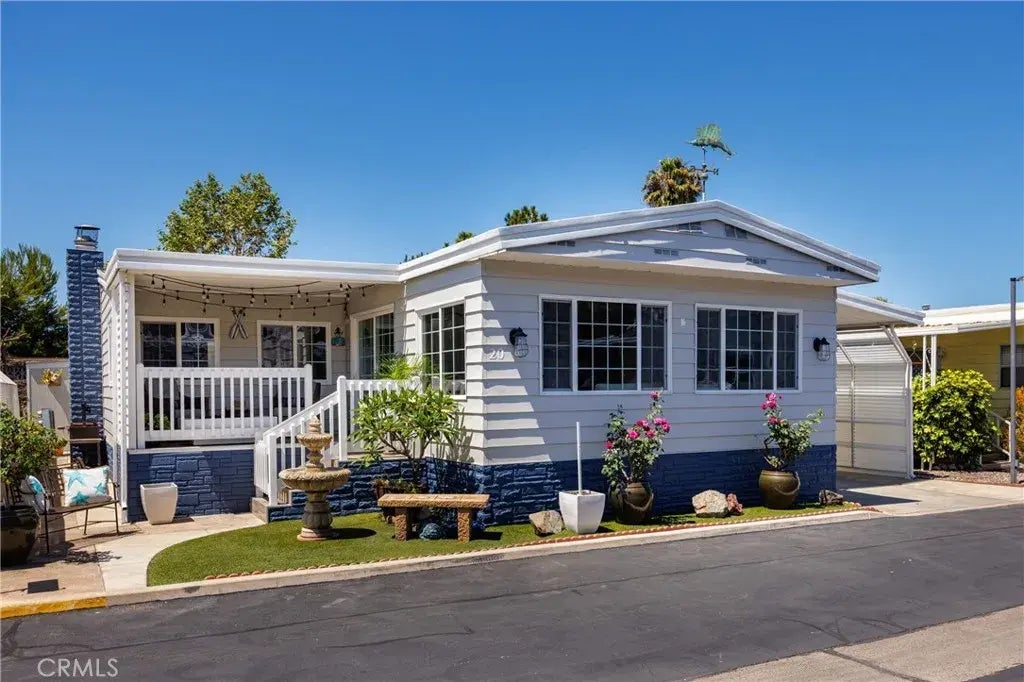 Located just minutes from Dana Point Harbor, this beautifully upgraded home offers approximately 1,550 sq ft of comfortable living space in a quaint and peaceful senior community. Originally a 2-bedroom home, it now features a spacious primary suite, a dedicated office space, and an extra-large family room with a fireplace and large built-in TVgreat for relaxing or hosting game night. The kitchen is a standout, with quartz countertops, soft-close drawers, and matching Caf by GE appliances, including a 6-burner stove and wine fridge tailored for both red and white wines. Designed with organization in mind, the interior remodel includes built-in California Closets throughout for efficient storage. The primary bathroom has a dressing area with vanity lighting and extra closet space. The guest bath offers a stylish walk-in shower and lighted mirror. The porch area welcomes you with artificial turf, a tranquil water feature, and a large gas firepitperfect for enjoying a peaceful evening outdoors. Additional features include a separate laundry/pantry room with washer and dryer, ambient lighting throughout, roof installed in 2021, interior remodel completed in 2022, and (2) handy outdoor sheds. Parking is also available on-site. With low HOA fees of just $404/month and no space rent, this home is ideal for year-round living or as your relaxing beachside getaway. Community amenities include a pool, clubhouse, shuffleboard, and billiards. Enjoy the best of coastal living near shops, restaurants, and local attractions like Dana Point Yacht Club and Laguna Beach.