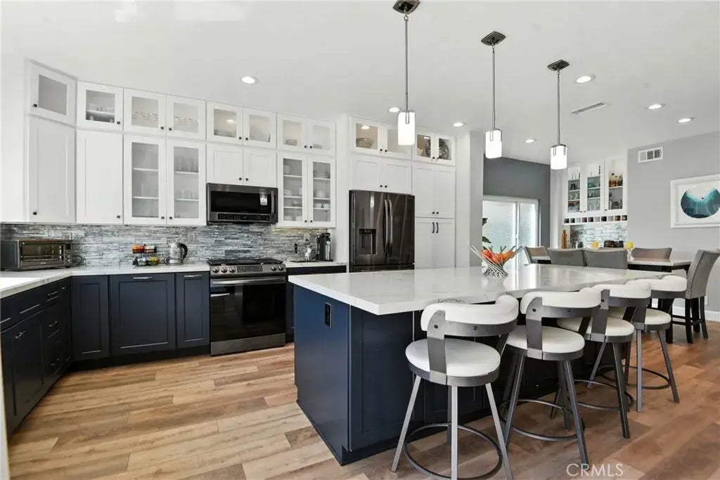 Located at the end of a cul-de-sac in Anaheim Hills, this beautifully reimagined 4-bedroom, 2.5 bath home combines modern design, thoughtful renovations, and sweeping hillside views. Extensively renovated inside and out, the 2,096 sq. ft. residence has been designed for comfort, style, and low-maintenance living. The home underwent a fully permitted transformation in 2021, opening downstairs into a seamless layout that flows from the kitchen to the dining and living areas. The redesigned kitchen features all new cabinetry with in-cabinet and under-cabinet lighting, quartz counters, a large center island, stainless steel appliances, and a reverse osmosis drinking water system. The dining room includes a built-in bar, creating an ideal space for both everyday living and entertaining. Upstairs, the primary suite is a true retreat with a spa-like bathroom completed in 2023, offering dual vanities, a soaking tub, and a walk-in shower, all framed by hillside views and evening Disneyland fireworks. Both the secondary bathroom and the downstairs half bath were fully renovated in 2023, while stylish new stair railings and plantation shutters installed throughout the upstairs in 2022 bring a clean, contemporary finish. The exterior has been enhanced with upgrades completed in 2023 and 2025, including artificial turf, pavers, a sitting wall, a new irrigation system with backyard drip lines, and professional landscaping with solar lightingall designed for low-maintenance enjoyment and lasting curb appeal. Additional features include a 2-car garage with workspace, floor-to-ceiling cabin
