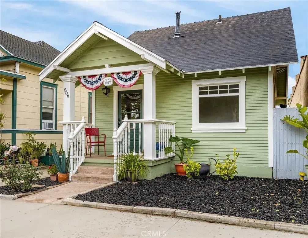 Charming and updated historic Santa Ana French Park home! Spacious backyard with a large patio, multiple planting areas, and its own private garage. Great first impression as you ascend the steps to the elevated front porch. Notice the covered sitting area and decorative craftsman columns that welcome you to 806 Minter Street. This desirable, detached home has a fresh, light and bright interior with new custom paint, and timeless ceramic tile flooring downstairs on a diagonal pattern. The original 1917 hardwood flooring upstairs has been beautifully refinished, and the bathroom has been remodeled. Step out back and enjoy Southern California weather year-round. The yard is fully fenced and offers attractive pavers, raised planters, a garden, and a portable firepit. There is plenty of space to BBQ and entertain outdoors. Zero maintenance concrete side yard. Back inside, the front room has a picture window facing the front yard. There is a dedicated eating area with built-in cabinetry, including drawers and upper glass door display shelves. The efficient kitchen boasts ample counter space, custom tile decorative backsplash, and a dual basin stainless steel sink that includes a pullout faucet and window above. Note the stainless steel GE 4-burner gas range and built-in microwave above. Off the kitchen is the highly coveted indoor laundry room with a full-size Maytag Centennial washer and dryer included. There is a main floor bedroom with a walk-in closet. The fully updated bathroom has a new pedestal sink, shower over the tub with a glass door enclosure and wall to ceiling cust