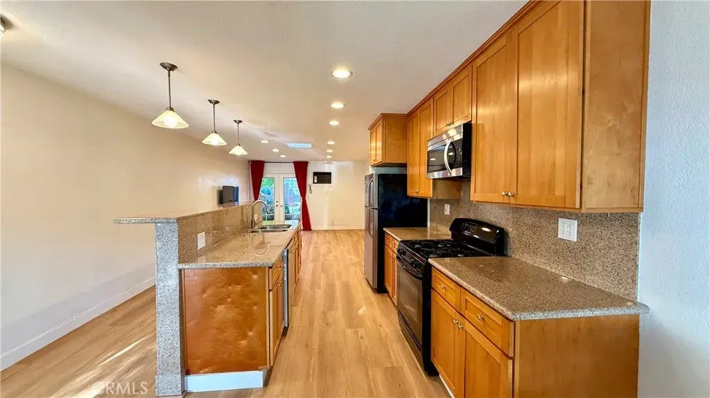 Spacious ground-level 2 bed / 1.75 bath home in a quiet, well-maintained Huntington Beach community. Recently updated with brand new luxury vinyl flooring and fresh Chantilly Lace paint, this light-filled unit offers a spacious open floor plan, skylight, full kitchen with refrigerator, stainless steel dishwasher, gas range/oven, granite countertops, and ample cabinet space. Bedrooms feature mirrored closets and plenty of storage, while each room is equipped with wall-mounted A/C units. Bathrooms include comfort-height toilets and vanity storage. Enjoy outdoor living with French doors opening to a private patio with drip irrigation, plus a semi-private retreat off the primary bedroom. Community amenities include on-site laundry with Speed Queen commercial machines. Reserved parking and garage options available. Water & trash included; tenant pays gas and electric. Pet-friendly with deposit and monthly pet rent. Prime Location: Across from Bella Terra Mall (Costco, Costco Gas, Starbucks, Whole Foods, Kohls, restaurants, movie theater, Old World Village). Please do not use Zillow map and use Google Map. This is not near Main Street. Close to Target, Sprouts, Walmart, and South Coast Plaza. Easy 405 Freeway access and just minutes to Huntington Beach Pier, Pacific City, and local parks.