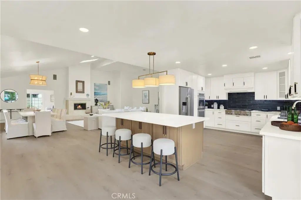 Spectacular single-level updated home of over 3,000 square feet nestled on a cul-de-sac in the highly desirable area of Eastside Costa Mesa. Located near Newport Back Bay, this jewel with a lot size of nearly 8,300 square feet exudes the beach vibe with sophisticated coastal charm. As you enter the foyer, meander into the enormous living room with vaulted high ceilings, skylights for optimum light, inviting fireplace, adjacent dining space, and an attractive open floor plan which leads you into the stunning remodeled Island Kitchen with new custom Asheville Cotton white oak cabinets, new stainless steel appliances, new luxury plank flooring, new recessed lighting, dazzling large island bar with Whiskey Royale white oak cabinets, built-in wine cooler, food pantry, new premium sink and faucet, and gorgeous brass cabinet door handles with brown leather inlays. This impressive home has new luxury plank flooring and baseboards throughout, new interior paint throughout, new exterior paint throughout, new lighting, owned solar panels, and much more. Adjacent to the living room, is a room with many options including a family room, den, or office with direct access to the backyard. As you transition to the 3 bedrooms, you will exit stage left to the spacious primary suite with large walk-in closet, high ceilings, luxurious bathroom with new travertine tile, new quartz countertops, new faucets and lighting, new seamless glass shower, and a relaxing soaking tub. As you stroll over to the middle bedroom you will be greeted with a staircase up to a loft ideal for a children's play area