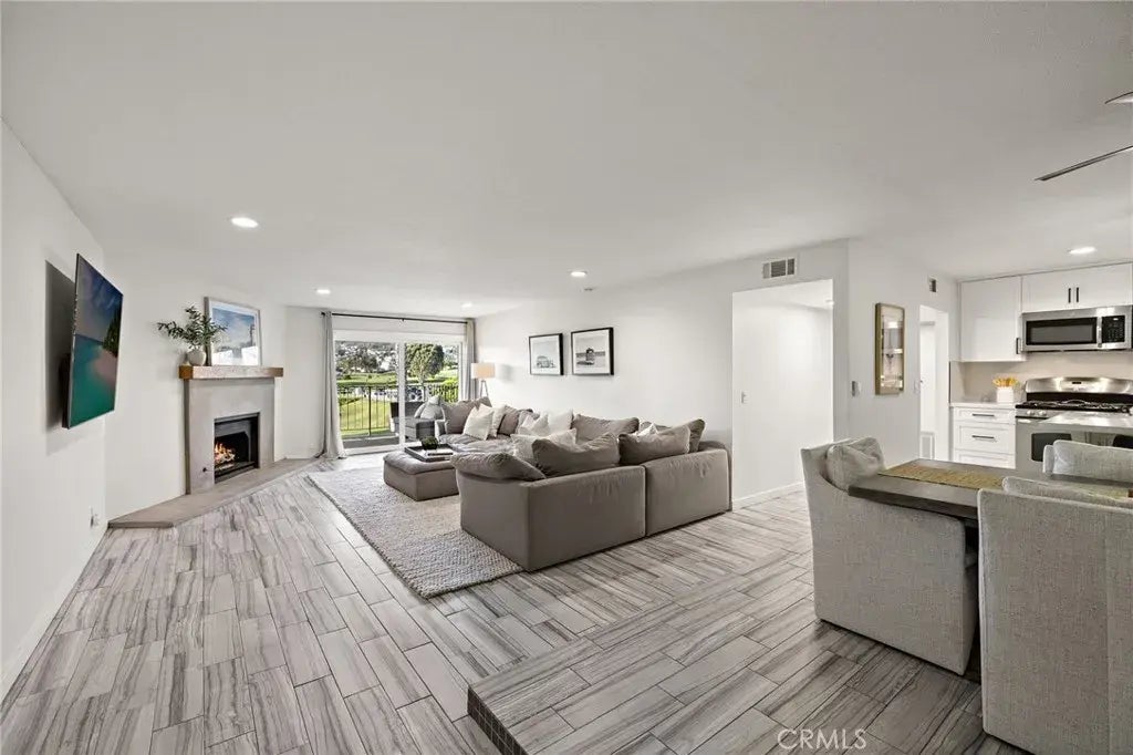 Perched on the top level of the Ocean Fairways community, this upgraded two-bedroom, two-bath home offers 1,326 square feet of single-level living and a rare vantage point over the lush fairways of the San Clemente Municipal Golf Course, with glimpses of the ocean beyond. Large windows and a spacious covered balcony draw in light and capture the home's tranquil setting. Inside, a modern concrete fireplace with custom mantel anchors the open living area. The kitchen combines quartz countertops, subway tile accents, ample cabinetry, and breakfast-bar seating for effortless everyday use. The primary suite enjoys wide golf course views, a generous closet, and an updated bathroom with double vanity and walk-in shower. A secondary bedroom and full bathroom complete the layout, while a dedicated laundry closet adds everyday convenience. Residents enjoy a private, gated community with countless amenities pool, spa, tennis courts, recreation lounge with kitchen and fireplace, fitness rooms with saunas, and secure building access. HOA dues include water, cable TV, sewer, trash, insurance, and exterior maintenance offering exceptional value and low-maintenance living. The location is a standout. Set directly across from the San Clemente Municipal Golf Course, the home also offers easy access to Vista Bahia Park and San Luis Rey Park for outdoor recreation. Plus, its only .9 miles to Calafia Beach, 1.6 miles to downtown San Clemente, and a short ride to Trestles, one of Southern Californias most coveted surf breaks. Golf cart and e-bike accessibility make it simple to reach beaches,