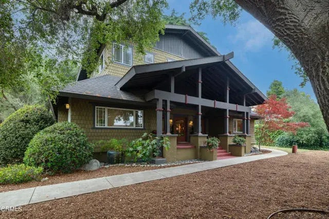 Welcome to your quintessential Craftsman retreat, a stunning 2-story Arts & Crafts period home nestled on a park-like double-lot in Altadena. As you drive up the private, gated driveway, the grandeur of this home is revealed, starting with a 2-story high covered front porch exuding classic Craftsman charm. Inside, you're greeted by original hardwood flooring, wood box beam ceilings, & a majestic brick fireplace with a wood mantle, now serving as a decorative centerpiece. The spacious living area flows into a formal dining room with French doors leading to the side yard, perfect for indoor-outdoor living. The gourmet kitchen is a chef's delight, featuring top-of-the-line Thermador appliances, a restaurant-style refrigerator & freezer, a gas range, dishwasher & ample cabinetry with tile countertops. The adjacent family room, also with French doors, opens to the expansive backyard, creating a seamless connection between indoor & outdoor spaces. On the first floor, you'll find 3 of the home's 6 bedrooms. The front bedroom boasts hardwood floors & picture windows, while a charming hallway leads to a bathroom with a clawfoot tub beneath a bay window. 2 additional bedrooms, both with large closets & hardwood floors, are found here, with one offering a window bench seat & French doors to the backyard. A second full bathroom features a soaking tub, tiled shower & single-sink vanity is found before heading upstairs. Ascending the oak staircase you'll discover a great room with vaulted ceilings, wood beam accents & French doors opening to a spacious balcony overlooking the lush backya