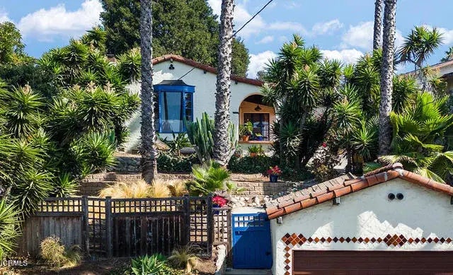 Sited far above the street in a grove of mature Yucca trees, this 1933 Spanish feels like a step back in time. Past the river rock front wall, a terraced front desert garden boasting stately fan palms, grasses and euphorbia cactus leads to the home's arched covered front porch. From the warmth of the hand troweled stucco walls to the clay tile roof and carved wood trim, there is so much preserved architectural character in this almost 1,900 SF home. The floor plan unfolds naturally with an entry vestibule floor tiled in terra-cotta hexagon and flanked by twin draped arches and flowing to the large living room to the west and dining room to the east. This home truly retains integrity in architecture and materials: living and dining rooms both feature beautiful original wood casement windows, creamy plaster walls, as well as coved and vaulted beamed ceilings, and decorative fireplace in the living room. The generous windows in both rooms open onto the porch and can act as doors to pass in and out -- this is a great home for entertaining. The warm rustic vibes carry through to the kitchen with special hand painted tile backsplash and custom tile floor. Chefs and homebodies will revel in the traditional butler's pantry just off the kitchen offering convenience, storage, and utility with a large countertop adjacent to the laundry room. The plan of this home is conducive to easy living: three quiet, sizable bedrooms and two baths are well set apart from public rooms. A real bonus: additional office and studio offer space to create, with views of the majestic live oak trees behind