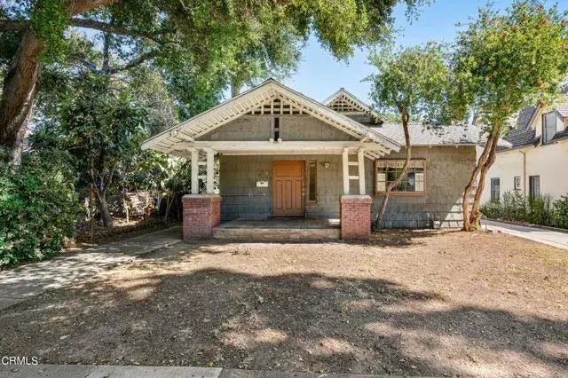 See history come alive in this three-bed/one bath, single-story Craftsman with its glass and brass doorknobs, back on the market after many years. Built in the 1920s, this home is set back from the street with its gabled front porch greeting visitors from beneath a multi-gabled roof. Vibrant red bottlebrush and a mature oak adorn the front yard and off to the side, a paved driveway leads to the unattached garage in the fully-fenced backyard. Just inside, the living room's large airy windows and central fireplace illuminate the room, set off by hardwood floors and simple molding. A sitting room/bedroom leads to the living room and formal dining room with wainscoting & a period light fixture, followed by a quaint kitchen and laundry room.Off the central hallway are two bedrooms: the primary with its five windows to bring in natural light and a door opening to the backyard. A 3/4 bath and spacious walk-in closet separate the primary from the second bedroom which looks out to the side yard. Additional features include two paved patio areas for outdoor seating and a grassy area in the backyard with mature trees offering quietude and solace. Located on a quiet, tree-lined street that dead-ends to cars but is open to foot traffic, this property evokes South Pasadena's ties to the past while offering access to great schools, parks and eateries in a city known for its world-class public safety.