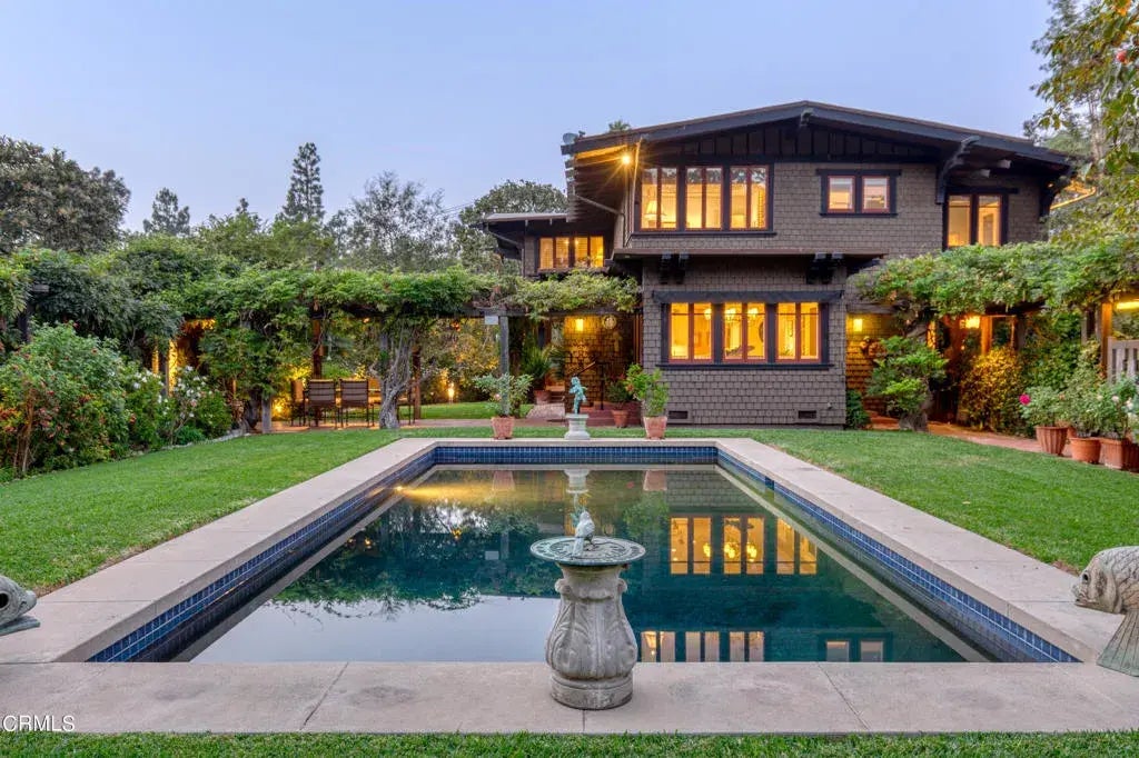 Welcome to the Bentley House, a 1912 craftsman style home designed by renowned architect Frank M. Tyler, located on over half an acre of lush grounds in Southwest Pasadena. This 4-bedroom, 6-bathroom Craftsman-style home beautifully blends period craftsmanship with modern updates, offering an unparalleled living experience.Upon entry, you're greeted by the foyer showcasing hardwood floors, crown moldings, and intricate door surrounds, architectural details that repeat throughout the home, creating a cohesive and rich aesthetic. The living room is centered around a gorgeous fireplace and connects to a cozy library, ideal for reading or quiet contemplation. Across the hall, the elegant dining room is perfect for hosting intimate gatherings.The remodeled chef's kitchen seamlessly blends modern amenities with vintage style, featuring subway tile backsplashes, stainless steel appliances, and a large built-in banquette eating area. Upstairs, three of the bedrooms offer privacy and space, including the luxurious primary suite, which boasts a separate seating area leading to a private front deck, a large walk-in closet, and a full bath. Two additional bedrooms, each with ensuite bathrooms, offer comfort and style, while a den provides flexibility as a possible fourth bedroom.The home sits on over 1/2 acre and with an expansive backyard which that includes a large lawn area, a gorgeous pool area that is encircled by a 100 year old wisteria, a rose garden, an enormous greenhouse and multiple fruit trees. A bonus feature of this extraordinary property is the guest house, complete with