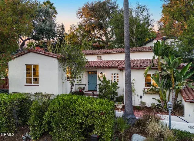 This infinitely special Spanish Colonial Revival home in the San Rafael Hills of Pasadena is rustic yet elegant, romantic yet stately, refined yet warm and all of the complex contradictions that make this architecture irresistible. Sited on the south-facing side of Cherry Drive, with views of the Poppy Peak Historic District and beyond, this home transports its visitors to a relaxed, style-rich and elevated point of view. Hand-troweled stucco, a classic red clay barrel tile roof with curved rafter tails and recessed entry define the exterior of this 1933-built property. Follow the brick walkway to the front porch flanked by Arbutus and Bottlebrush trees, and open the 'Julia Morgan blue' front door to reveal a spectacular Magnesite floor inside. Molded into harmonious octagonal and Saltillo brick patterns with hand painted Spanish tile details, the entry floor and ironwork set the artisan tone. Vaulted beamed ceilings define public spaces here: in the entry, suspended over a hand-carved wood beam, and in the living room: a cathedral ceiling lined with tongue and groove paneling. Featuring a rustic decorative brick fireplace with iron-front wood storage vault, the living room boasts casement picture windows to the front, framing the view of a Camphor tree. With southern exposure, both the living and dining rooms are light-filled, with peg-in-groove hardwood floors and velvety white plaster walls. Through french doors, the dining room offers access to a private balcony with southern tree top views...and to the north, the patio and backyard. Adjacent to the dining room, find an