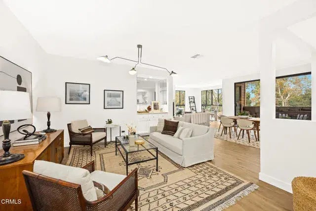 Chic single-level condo sited in Burbank's highly desirable Rancho Equestrian Neighborhood features an enviable open floorplan of 1,683 square feet illuminated by natural light from the floor to ceiling windows. The unit evokes a mid-century vibe with an attractive double door entry leading to the light-infused, open-concept living/dining/family room spaces featuring high ceilings, floor to ceiling picture windows, a central fireplace with built-in shelves, new luxury vinyl wood-like flooring and the ease of connection to the large balcony for added entertaining space and enjoyment of the tree-line view. The kitchen features updates such as quartz counters, glass-fronted cabinets, recessed lights and plenty of storage space and functionality. The floor plan allows separation and privacy between the common living spaces and the two en-suite bedrooms. A large primary bedroom features floor to ceiling windows, a full en-suite bath with double sink vanity and a generously sized walk-in closet. The second bedroom is also nicely sized and offers floor to ceiling windows, a walk-in closet and its own three-quarter bath. In addition to the pleasing aesthetics of this unit, the new owners will be pleased to learn of the 2022 installation of a 3-ton Goodman HVAC system with a NEST thermostat, a 2023 installation of a 50-gallon electric water heater and 2024 updates that include new paint and vinyl wood-like flooring plus baseboards throughout, new living room light fixture, and a new high efficiency washing machine. This 15-unit complex is professionally managed for convenience of th
