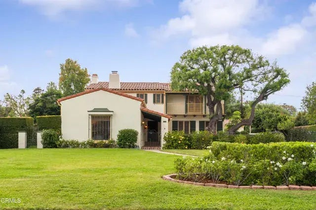 This stunning Mediterranean gem is located near the award-winning San Marino High School. On the market for the first time in 30 years, the estate features exquisite public rooms, five spacious bedrooms, three bathrooms, a library and a massive basement, making it the perfect blend of elegance and practicality. A lovely portale and central courtyard lead to the handsome front door. Inside, a romantic foyer displays a curved staircase with wrought iron banisters and terracotta flooring sets the tone. Behind a decorative wrought iron gate, the step-down grand ballroom living room showcases multiple French windows with views of the center courtyard, portale, and a picturesque window framing the front garden. This expansive space is adorned with 13' high open beamed ceilings, an authentic Spanish fireplace with marble hearth, an arched niche with display shelves, and a French door leading to the side garden. The library with built-in bookcases & a cozy fireplace has a vintage built-in wet bar tucked behind a beautiful wooden door. The formal dining room features wood beams accented with decorative carved corbels and scrollwork. A French door opens to the gated driveway area, and a swing door connects to a sunny breakfast room that opens to the rear patio. The kitchen features custom hand-painted tiles and adjoins a good-size mudroom that houses the laundry facility and a built-in workstation. A private guest bedroom with an adjacent full bath completes the 1st level. Other architectural details include doorway arches, original mahogany doors, and beautiful hardwood floors throu