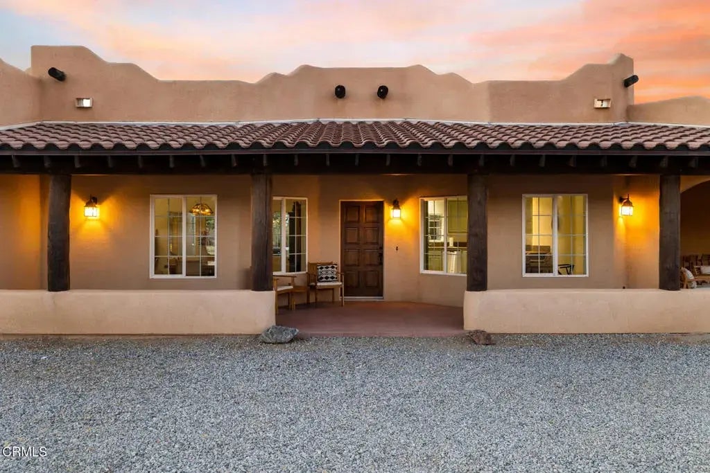 Welcome to 4966 Mormon Ave, a custom-built Santa Fe Adobe-style home in Yucca Valley's coveted Pinion Ridge neighborhood. Situated on over 2.5 acres, this property is surrounded by iconic Joshua trees and stunning mountain vistas, offering peaceful seclusion while remaining close to town. The open-concept design is warm and inviting, with a spacious living and dining area featuring vaulted ceilings, a cozy electric fireplace, and French doors to a covered patio. The eat-in kitchen is a chef's dream, complete with granite countertops, ample storage, newer appliances, a breakfast bar, and a skylight that fills the space with natural light. The luxurious primary suite is a true retreat, offering three closets--including a walk-in, French doors to the patio, and an en-suite bathroom with a soaking tub and shower. Three additional bedrooms, each with walk-in closets, provide plenty of space for family or guests. Central HVAC and ceiling fans in every room ensure year-round comfort, while the attached garage includes a convenient half-bath. Outside you'll find a massive covered breezeway supported by solid wood beams, perfect for dining or entertaining. The backyard features a hot tub, incredible desert views, and a flat, fully-fenced area ideal for adding a pool. Offset your utility bill with leased solar. Don't miss this rare opportunity to own a home with timeless character and modern amenities in one of Yucca Valley's most desirable areas.