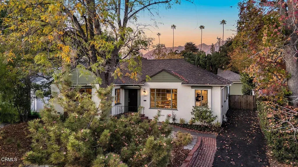 This enchanting traditional home, graciously sited on a gentle knoll is perfectly located close to the Altadena Town & Country Club. There is a charming brick front porch and the front door opens to a proper entry with dining room to the right and living room to the left. The generously-sized living room features a stately brick fireplace with original built-ins on either side and a beautiful south-facing window, that overlooks recently updated drought tolerant front landscape. Across the hall, the sunny dining room also has views of the front yard. The adjacent kitchen has warm Saltillo tile floors and rich cobalt tile counters and features a light filled breakfast nook. Beyond the kitchen is the laundry room, a 3/4 bath, and a small bonus room that makes an ideal office. The west side of the house contains the private quarters and features 3 bedrooms and 1 full bathroom, including a large main bedroom with direct access to the office and a sliding door to the backyard. The remaining two bedrooms are well proportioned and the hall bath is thoughtfully situated between them. The substantial backyard has beautiful mountain views and there are endless possibilities for landscaping or to create your own urban farm. Completing the property is a detached garage that was converted by the current owner to a bonus room. Finally at the NE corner of the property is a tuff-shed that was used as an art studio. This inviting home has been well cared for and is the type of property that has space for everything. This is a wonderful opportunity to live in this outstanding Altadena neighbo