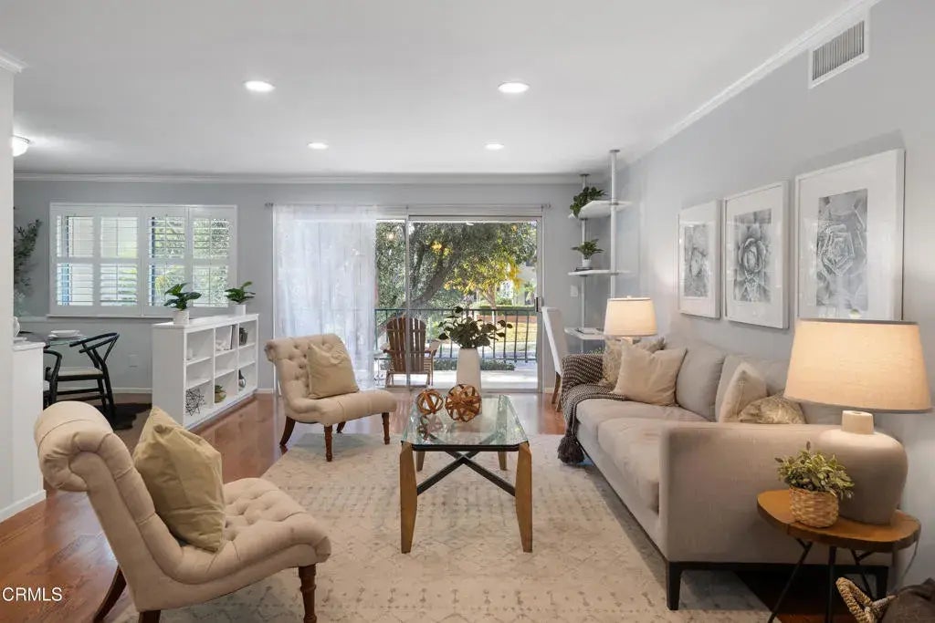 Welcome to Casa Serena, this beautifully updated condo is adjacent to Madison Heights in the heart of Pasadena. This stylish first-floor home combines modern updates with timeless elegance, offering both comfort & convenience. Upon entry, you're greeted by hardwood flooring that flows throughout the main living areas. To the left, a chic wet bar area features quartz countertops, a bar sink & a custom tiled backsplash that extends to the ceiling, framed by crown molding--a perfect space for entertaining. The living room boasts recessed lighting, crown molding & a large glass slider that opens to an oversized balcony, creating a seamless indoor-outdoor living experience. Adjacent to the living room, the dining area transitions effortlessly into the updated kitchen, which is equipped with quartz countertops & a custom tiled backsplash, stainless steel appliances, including a refrigerator, dishwasher, in-wall oven & microwave. A 4-burner Frigidaire electric cooktop with an oven hood, tile flooring & a pantry closet for ample storage. To the right of the entry, you'll find a hallway lined with linen cabinets & a walk-in closet, providing generous storage solutions. Across the hall is the first of two bedrooms, featuring built-in shelving & cabinets along one wall, a ceiling fan, crown molding & wood-louvered shutters over the windows. The adjacent 3/4 bathroom showcases a glass shower enclosure with custom tiled walls, hexagon tile flooring, a single-sink vanity with a custom tiled countertop & crown molding. The primary suite is a serene retreat with wood-like laminate flooring