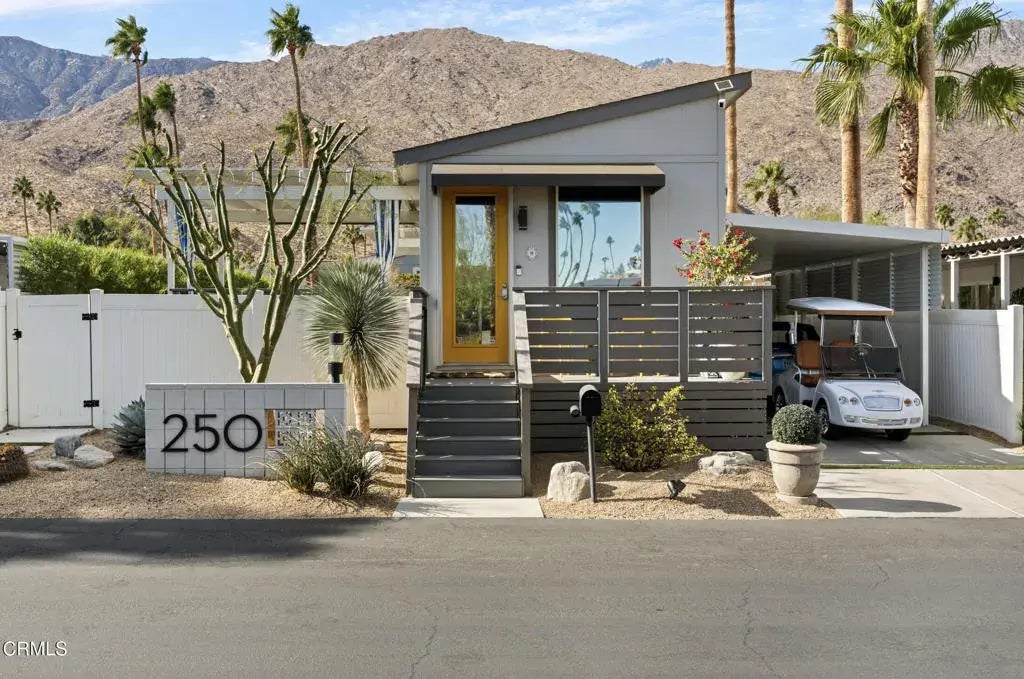 Sophisticated Palm Springs Pied a Terre in the highly desirable Palm Canyon Mobile Club. This beautifully designed 2018 home features 9' ceilings throughout with generous patios and a beautifully landscaped yard. New kitchen cabinetry, top of the line appliances, custom tile. Smooth finish walls throughout. Custom tile in the bathroom. New, custom vanity. Large main deck with shade structure. Custom awnings. Gardens designed by noted landscape designer. Incredible mountain views. All of this tucked into the best neighborhood in South Palm Springs between Twin Palms and Indian Canyons. Close to Koffi, ACE and Smoketree Plaza for shopping. Clerestory windows perfectly framing mountain and swaying palm tree views. A short walk to the recently remodeled clubhouse and pool. The Palm Canyon Mobile Club is meticulously maintained and offers a wealth of amenities. Community pool and spa plus the clubhouse features spacious indoor lounging areas, multiple seating spaces, a fitness room, kitchen facilities, a dance hall, a dog park, shuffleboard, and an on-site manager.