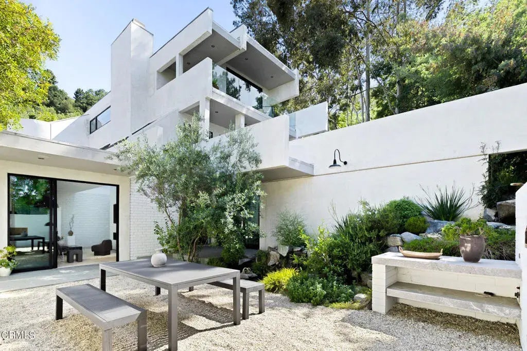 This stunning architectural residence sited along a private hillside features serene gallery-like interiors inspired by Scandinavian design on a private road in Studio City. Originally designed by Los Angeles architects Matlin and Dvoretsky, the sophisticated postmodern home extends across its 3/4 acre property, which features a sparkling pool and spa, private dining courtyard with pizza oven, and calming waterfalls throughout. Upon entering the home, one is struck by the natural light, impressive spatial volume, and views of nature through the large Fleetwood sliders and picture windows. The ground floor features a circular flow between its social spaces - a sunken living room, large dining space, and chef's kitchen with state of the art Thermador appliances. It also connects to the home's finished three car garage, office/5th bedroom, pool bathroom, one of two laundry rooms, and a secret powder room. Either take the elevator or the sculptural stair to the second level where a light-filled corridor connects the three bedrooms and two bathrooms with a large den that opens to a lounging balcony. The third level houses the expansive primary suite, replete with a kitchenette, two walk-in-closets (one with additional laundry) and a spa-like bathroom featuring a steam shower and its own private lounging terrace with distant city and treetop views. The residence features a Control4 Smart Home system, wide plank oak floors, multiple outdoor lounging spaces and a den perfect for a media room. The property is conveniently located between Studio City and Hollywood with access to Stud