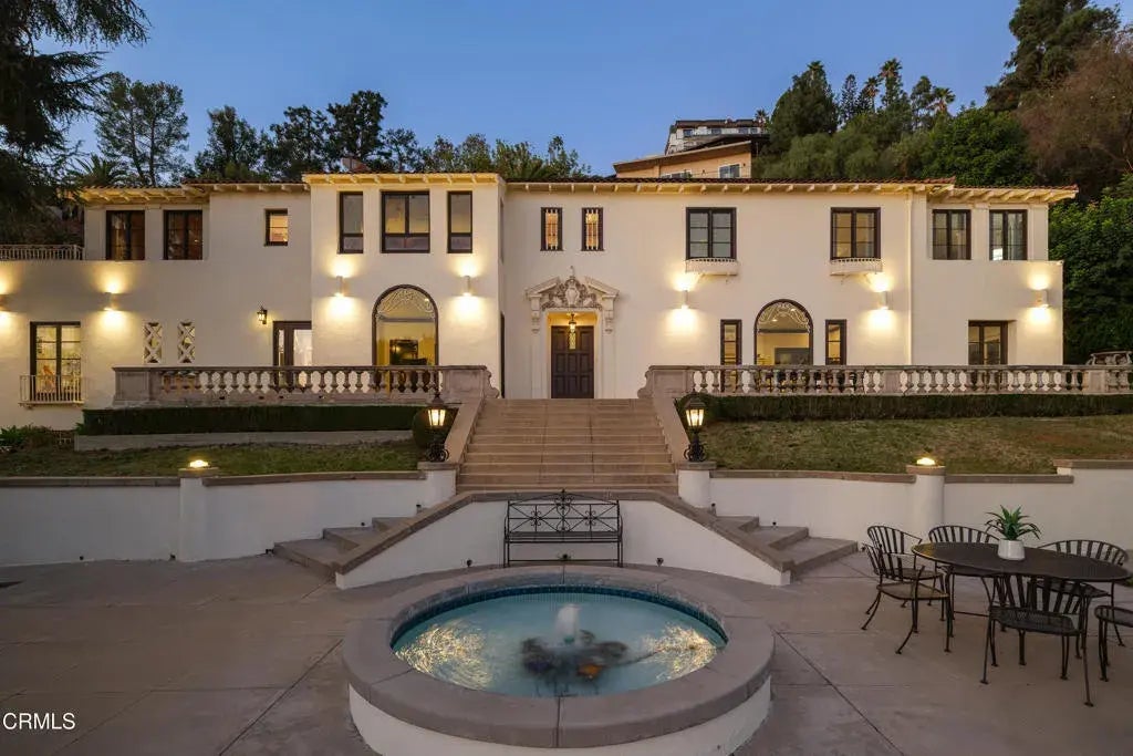 This Italian Revival chef-d'oeuvre, stands proudly at the end of a tranquil cul-de-sac, exuding elegance and timeless distinction. Designed and built by the celebrated Meline Company in 1921, the estate is steeped in architectural significance. It is highly likely that the renowned architect Wallace Neff, a key figure within the company's team, played an instrumental role in its design (House Biography). Approaching this majestic Mediterranean masterpiece, one feels instantly transported to a realm of Italian sophistication fused with Old Hollywood glamour. Nestled on over half an acre, the property boasts 4 bedrooms, 5 bathrooms, and a private apartment, offering a lifestyle of unparalleled luxury. The essential systems of the house have thoroughly modernized. The sumptuous living room, adorned with a showpiece fireplace, features original hardwood floors and a dramatic arched glass window that frames serene views of the meticulously manicured gardens. Adjacent, the light-filled music room and library open onto a patio highlighted by a centerpiece fountain, crowned with statues reminiscent of a Florentine piazza.The formal dining room is a work of art in itself, with intricate crown moldings, an arched glass window, and gleaming original wood floors. A chef's dream, the expansive kitchen is equipped with a butler's pantry, high-end stainless-steel appliances, and an oversized island, creating the perfect space for culinary creations. The first floor also includes a guest suite, currently used as an office and a powder room. A turning staircase framing an elegant entry hall