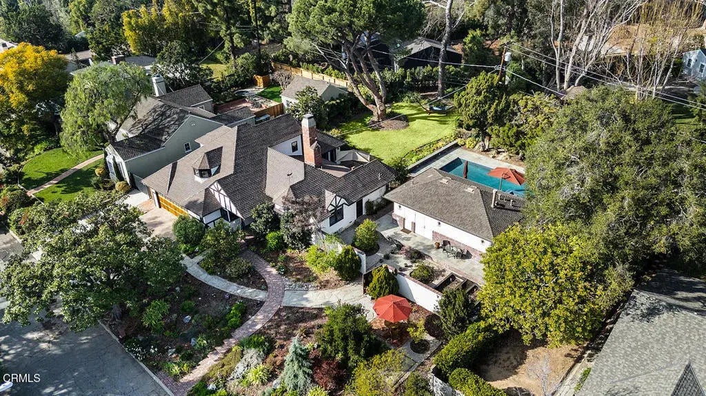 Nestled on a serene cul-de-sac in prestigious southwest Pasadena, this beautifully updated English-style home offers an elegant blend of timeless character and modern convenience. Situated on over a third of an acre, this stunning 4-bedroom, 5-bath residence boasts exquisite craftsmanship, thoughtful updates, and an inviting ambiance.Beyond its picturesque brick facade and storybook charm, the home features gracious living spaces filled with natural light, including a formal living room with a fireplace, an adjacent dining room, and a gourmet kitchen with top-of-the-line appliances and custom cabinetry. Each of the 3-spacious bedrooms includes an en-suite bath, providing ultimate comfort and privacy. A fourth bedroom with a 3/4 bath presently serves as an office and has direct access to the 2-car attached garage and laundry area. The luxurious primary suite offers a spa-like retreat with a soaking tub, an oversized shower, and a custom-designed walk-in closet.Step outside to a breathtaking award-winning garden, where lush and thoughtful landscaping, mature trees and specimen plantings, and winding pathways create a tranquil oasis. A sparkling pool, outdoor BBQ kitchen and an inviting pool house provide the perfect setting for relaxation or entertaining, with additional space ideal for a home office, gym or studio. This is a rare opportunity to experience the finest of Pasadena living in a private and enchanting setting.
