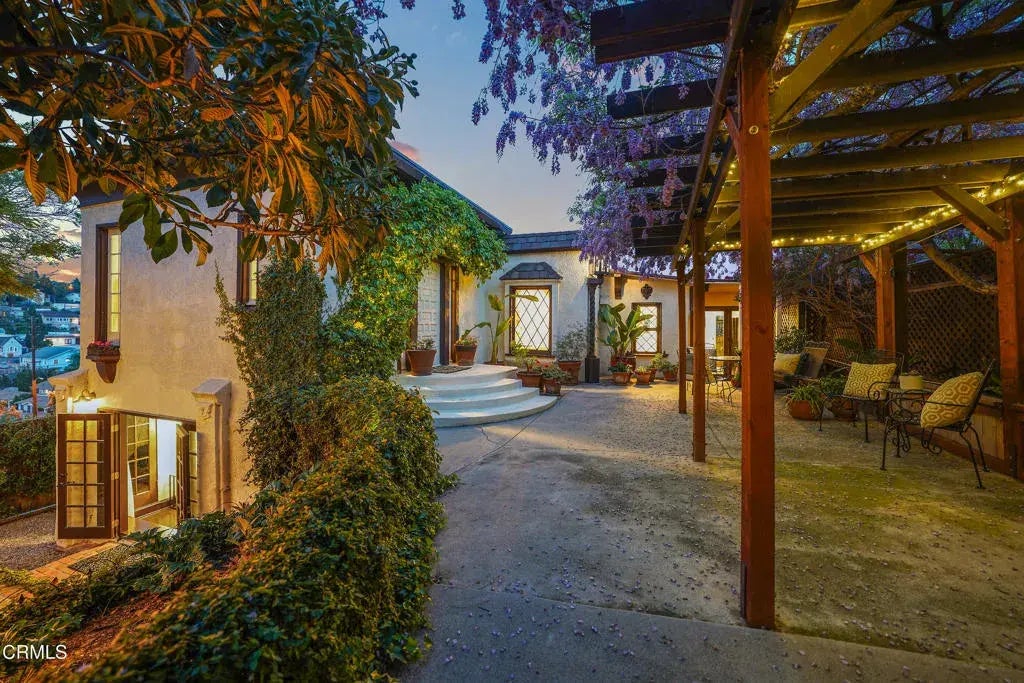 This incredibly romantic Highland Park home, built in 1923, features amazing views from every vantage and seamlessly combines Mediterranean Revival character with undeniable storybook charm. The home has amazing architectural elements, including hand-carved wood accent details. Set back from the street, the home was built by German watercolor artist Fritz Poock. Down the driveway, you are greeted by a magnificent wisteria-covered pergola. The living room is stunning, with a unique fireplace, original wood flooring and multiple arched windows which offer spectacular hillside and mountain views. Off the living room there is a sunroom/office (with a closet so it could be used as a third bedroom). This room features Saltillo tile flooring, a wood-beamed ceiling and multiple oversized arched windows that capture stunning 180-degree views that change with every season. The dining room is framed by a variety of interesting arched doorways and the charming kitchen also features Saltillo tile flooring and offers amazing hillside views. A powder room completes the main level of the home. The downstairs portion of the home offers two additional bedrooms and a full bathroom. The primary bedroom is a true retreat, with French doors that open to the lovely yard with a relaxing wall fountain water feature. The yard seamlessly combines garden areas with a variety of patios and seating areas - perfect for entertaining or unwinding at the end of the day. Best of all, the home is just a few blocks from the Metro station and offers close proximity to Highland Park's vibrant restaurant and bar