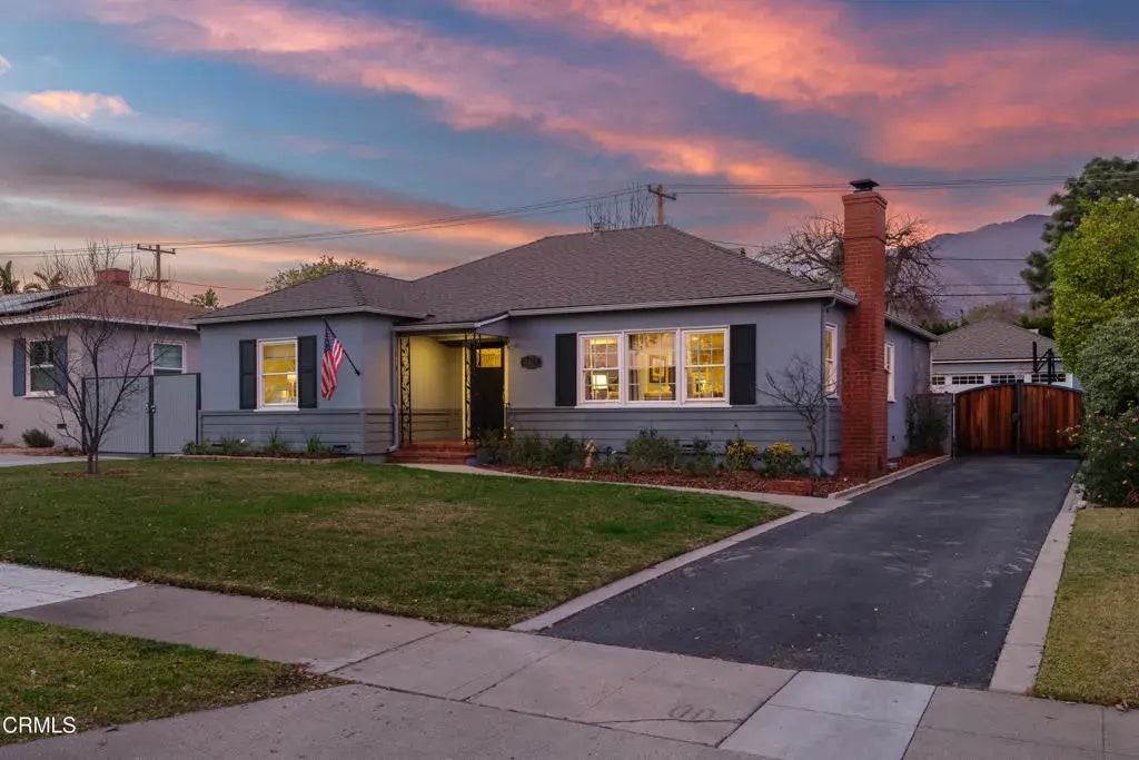 Situated on a picturesque tree-lined street in Pasadena, this beautifully remodeled home blends timeless charm with modern convenience. A welcoming covered brick front porch invites you into an open floor plan where bamboo hardwood flooring flows seamlessly throughout. The spacious living room, bathed in natural light from 3 large dual-pane windows, features a classic brick fireplace with a traditional mantle. A built-in dry bar with a wine refrigerator & wine rack adds an elegant touch. The living area effortlessly transitions into the dining space & an expansive kitchen, designed for both functionality & style. A large kitchen island with stone countertops & bar seating, opposite a farmhouse sink, black stainless steel refrigerator & a walk-in pantry provide ample storage. High-end appliances include a wall oven, microwave & a five-burner gas cooktop with a pot filler. A charming painted brick backsplash & recessed lighting complete this stunning space. A conveniently located full bathroom off the main living area offers a single sink vanity with a stone countertop & a tub/shower combination. Adjacent to the kitchen, a dedicated laundry room with cabinetry & side-by-side washer & dryer leads to the backyard. At the rear of the home, the luxurious primary suite offers a peaceful retreat. Bamboo hardwood flooring continues here, complemented by recessed lighting, a ceiling fan, a built-in desk/vanity space & French doors opening to the backyard patio. Passing between 2 walk-in closets you'll discover the spa-like ensuite bathroom featuring 2 separate single-sink vanities, a