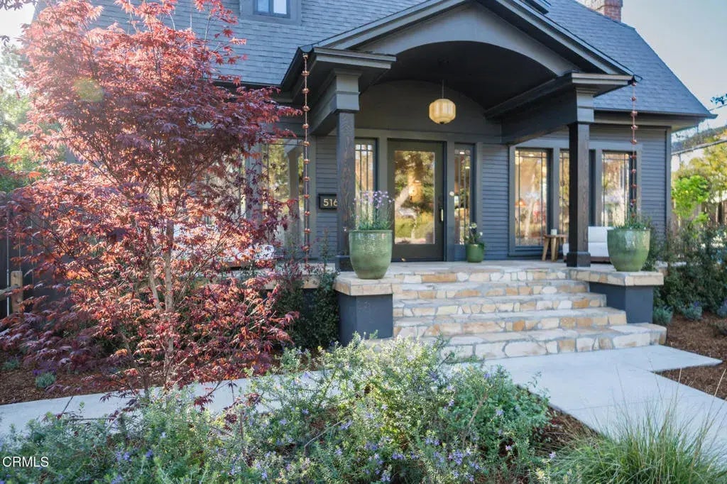 Eagle Rock offers community, tree-lined streets, delicious restaurants, coffee houses, a fantastic school district, convenience in location, and great shopping. On Highland View, a well sought after street, sits this stunning remodeled/reimagined1922 California Cottage with gorgeous mountain views. This home offers a lifestyle of elegance and comfort, ideal for any family. The corner lot provides peace, quiet and serenity. Thoughtfully designed, this home achieves a balance of original/old world charm & eclectic contemporary living. Front yard is a garden oasis of lavender, rosemary, salvia, Japanese maple trees, a guava tree and more, securing exceptional fragrance and privacy. Arizona flagstone porch is ideal for afternoon drinks amidst the garden. Original completely restored front door and floor to ceiling windows make excellent curb appeal. Open floor concept begins as you enter the formal living room with handsome built-ins, storage bench and original fireplace. Chef's kitchen with custom cabinetry, vintage hardware, hand-crafted zinc hood, quartzite leathered countertops, Fisher & Paykel appliances, storage, walk-in pantry, direct access to entertainment deck, large island, and dining area that accommodates up to 12 comfortably, built in bench/storage and Tulum inspired chandelier. Main level includes charming guest bedroom, ideal for a home office, large family/media room or second guest bedroom, whimsical guest bath, lovely convenient powder room with floor to ceiling handmade tile, laundry room, and primary suite with vaulted ceilings, large walk-in, and en suite