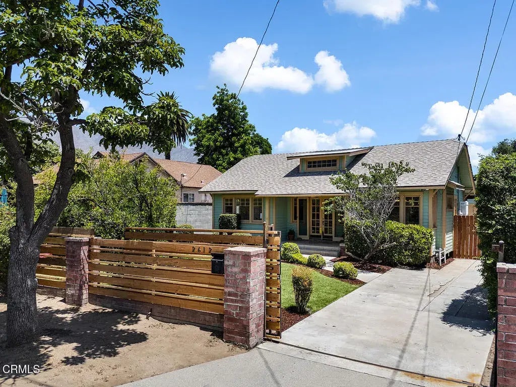 This beautifully updated California Bungalow in West Altadena blends timeless charm with modern comfort. Sited back from the street with a contemporary horizontal plank wood fence, the property enjoys mountain views from the grassy front yard. Classic 1924 Craftsman architecture is unspoiled here: the gently-pitched roof with shed dormer window, symmetrical facade and covered front porch with square columns and brick pedestals. Featuring three bedrooms and one bathroom, the home showcases original character details like wood-framed casement windows and elegant double French front doors. Boasting fresh interior paint, newly laid floors (Spring 2025), and updated systems, this home is move-in-ready. The remodeled kitchen includes newer shaker cabinetry, granite countertops and a just-installed stainless steel dishwasher. A fresh roof (June 2025) and HVAC system add to the home's overall value and efficiency. Enjoy the spacious backyard with mature fruit trees (lemon and nectarine, plus pomegranate in the front yard!) and a covered patio with a ceiling fan, a peaceful spot for morning coffee and ideal for open-air entertaining. A detached bonus room behind the garage offers flexible space for an office, studio, or storage. Located on a quiet, tree-lined street in one of Altadena's most charming and established neighborhoods - close to favorite taco spots, coffee roasters, Good Neighbor Bar, the just-renovated Loma Alta Park and soon to reopen Bob Lucas Library - this home is a rare find.