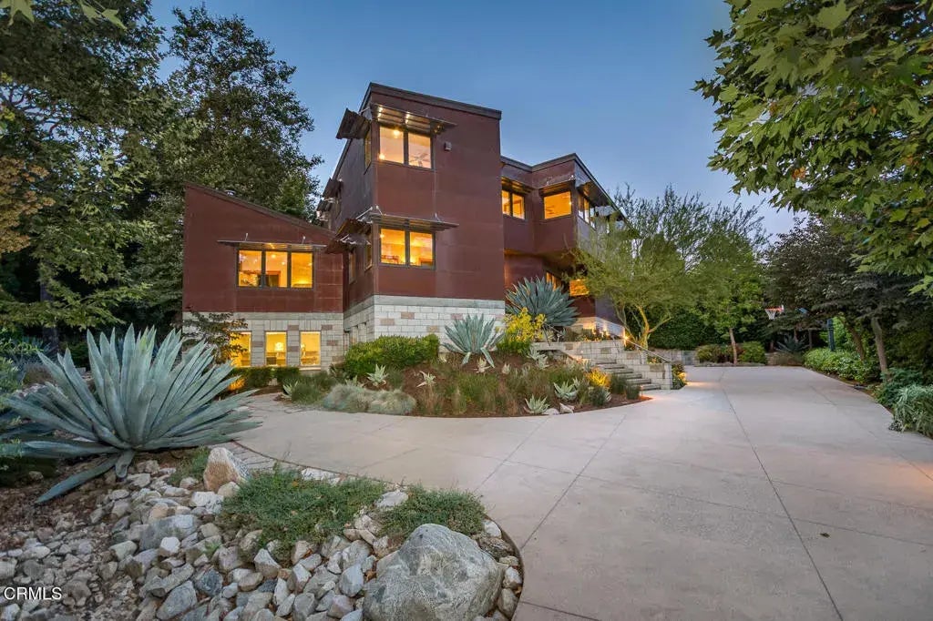 On the market for the first time since its conception, this extraordinary three-level estate was thoughtfully designed & built by its original owner, a professional architect. Set at the end of a long, gracious private driveway, the home blends sculptural form, enduring materials, seamless indoor-outdoor flow. Constructed with copper, concrete, Douglas Fir, commercial-grade systems, it offers visual distinction & long-term performance. A custom laser-cut stainless steel front door trimmed in exotic hardwood opens to interiors framed in Douglas Fir, where a floating copper 'cloud' conceals ductwork above the main hallway. The main level features a dramatic living room with soaring ceilings, acoustic slats, asymmetrical windows, & a cast-in-place concrete fireplace. Above it, the copper 'cloud' continues, concealing the flue & reinforcing the home's sculptural theme. The kitchen is both functional & refined, equipped with granite slab counters, two dishwashers, double ovens, a warming drawer, an oversized fridge & freezer, built-in trash drawers, & a walk-in pantry. A marble-topped buffet anchors the formal dining area, while the open family room offers built-in shelving & a copper-topped desk. Both rooms open to a covered patio & landscaped yard. A versatile bedroom or office & a guest bath complete the main level. Upstairs, the primary suite offers treetop views, a walk-in closet, & a spa-style bath with granite slab surfaces & a glass-block-accented walk-in shower with dual shower heads. Three additional bedrooms include a junior suite & two joined by a Jack-and-Jill bath.
