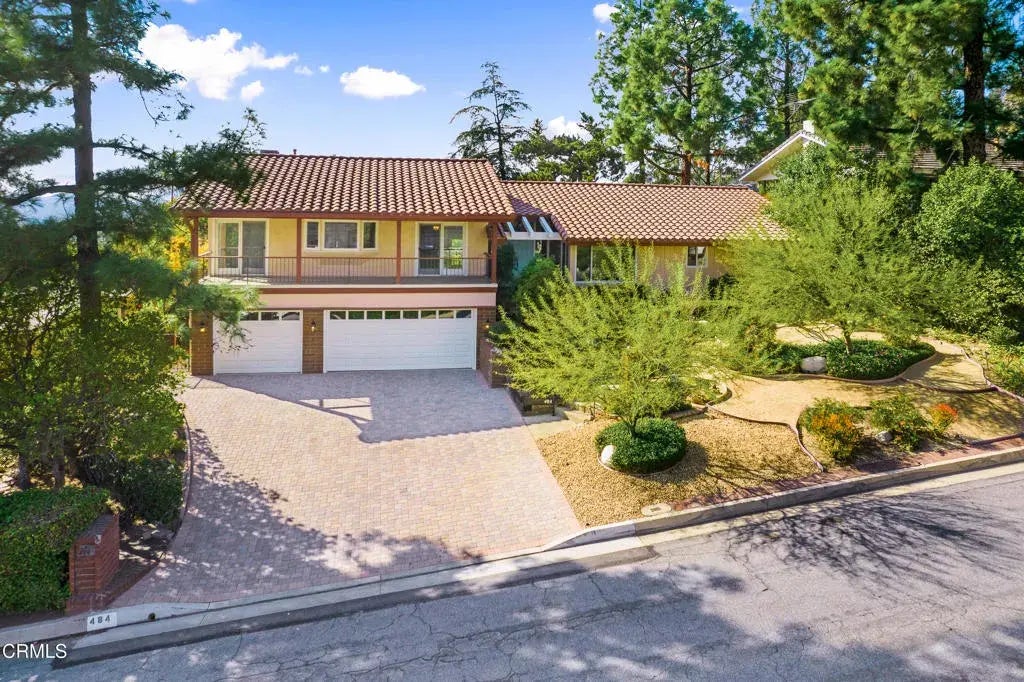 Views, Views, Views! Welcome to this spectacular La Canada traditional, where a versatile split-level floor plan offers a seamless blend of comfort, space, and natural beauty. Step through the double-door entry into an expansive living room with soaring wood-beamed ceilings, a gas-burning fireplace, and two sets of sliding glass doors that open to the backyard framing serene vistas and flooding the space with light. The adjacent dining room flows into a bright kitchen with generous cabinetry, double ovens, a dishwasher, and laminate flooring. A cozy breakfast area connects to a spacious balcony patio, offering an ideal spot to enjoy panoramic views of the San Gabriel Mountains. The private primary suite is a true retreat, featuring vaulted ceilings, a private balcony with stunning views, multiple closets, and an en-suite bath with dual vanities, mirrored closet doors, and a glass-enclosed shower. On the lower level, the family room invites you to relax with its built-in shelving, fireplace, and backyard access framed by beautiful scenery. This space also includes a convenient office nook and a three-quarter bath with exterior access to the pool. The west wing of the home features three additional bedrooms and a shared full bathroom. Additional highlights include: 3-car garage with direct home access, dual-paned windows, central A/C and heating, window treatments, laundry area in garage, attic with pull-down ladder. The landscaped grounds provide a picture-perfect backdrop with automatic sprinklers, a grassy play area, covered patio with BBQ area, and a sparkling pool and sp