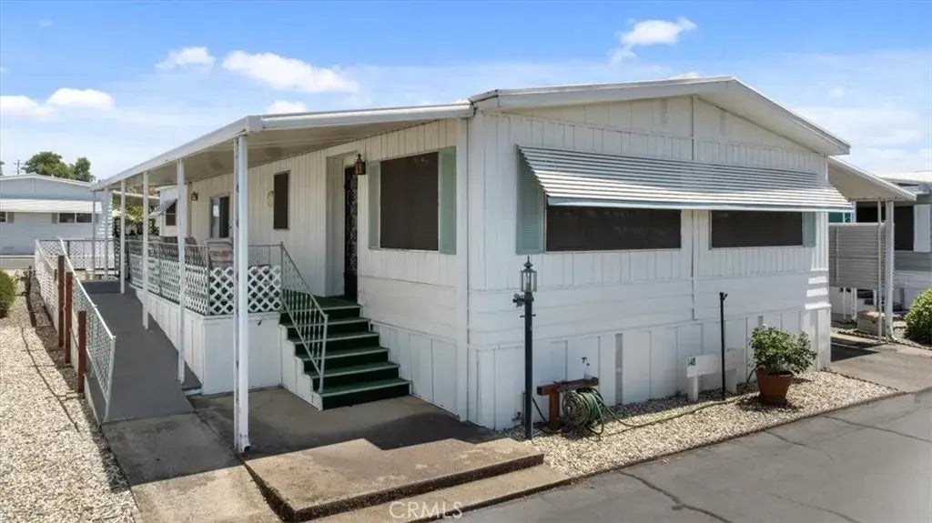 This beautifully updated 2-bedroom, 2-bathroom mobile home sits in the desirable 55+ Olive Hill community and offers 1,440 square feet of comfortable living space. Renovated in 2021, the home features new flooring, fresh paint, and updated trim that enhance every room. The kitchen stands out with quartz countertops, a gas counter cooktop, double ovens, a dishwasher, and an instant hot water tank, perfect for cooking and entertaining. The guest bathroom includes a walk-in tub, while the primary bathroom showcases a tiled shower. Enjoy the formal living and dining rooms, along with a separate family room that provides added flexibility. Step outside to relax on the large front porch or make use of the small fenced yard. Carports at both the front and back offer convenient covered parking. Located close to shopping and medical facilities, this home combines modern updates with a prime location. Land is leased at $800 per month, with utilities not included. A move-in ready home with style, space, and function.