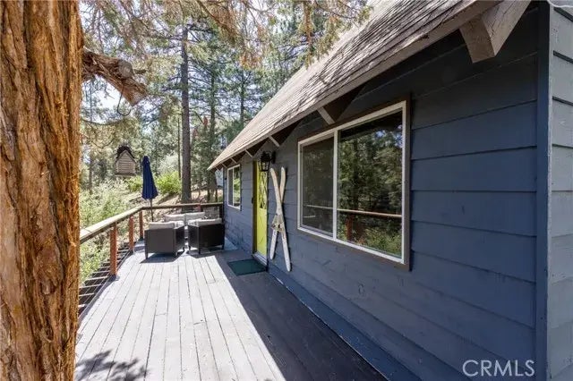 Nestled amidst the tranquil beauty of Big Bear City, this charming cabin sits majestically atop the hill, offering panoramic views of Gold Mountain. The remodeled kitchen is a chef's dream, boasting sleek stainless steel appliances, elegant countertops, and ample storage space. Prepare delicious meals while gazing out at the forest through the expansive windows. Throughout the cabin, meticulous attention to detail is evident. A cozy wood-burning fireplace invites you to relax and unwind after a day of adventure. With newer dual-pane windows, you can enjoy the stunning vistas while staying cozy and insulated from the elements. Entertain guests in the spacious dining and deck area, perfect for hosting holiday feasts and gatherings. Upstairs, vaulted ceilings in the bedrooms create an airy and inviting ambiance. This cabin is truly a turnkey home. Did we mention the newly installed EV Charger and upgraded panel? No more having to search for a charger when you get to the mountains! Whether you're seeking a weekend getaway or a permanent residence, this property offers everything you need to embrace the quintessential Big Bear lifestyle.