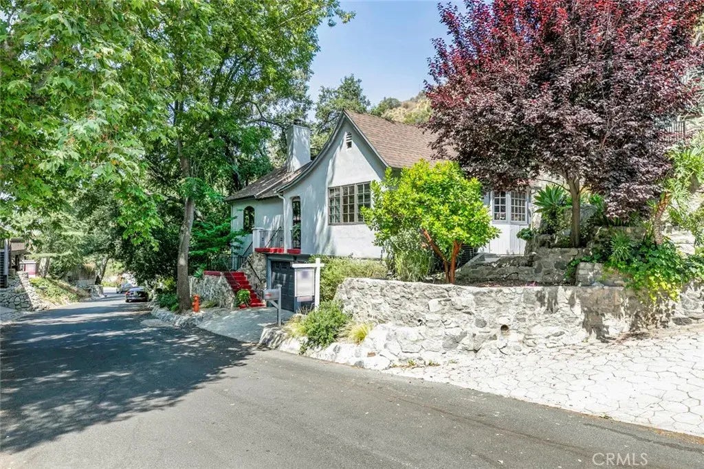 In the hills of Burbank is a neighborhood that almost feels like a secret. Less than 3 minutes north of Sunset Canyon is an enclave of 46 homes, varying in architectural styles, where the tenure of ownership spans half a century, averaging 17 years. Similar to mountain destinations, nature and serenity abound and here you will find a home that truly feels like one. Originally built in 1929, the home was enlarged and re-imagined by a previous owner in 2006. A two-story private retreat, harmonious to the surrounding greenery, with a happy vibe and an airy floor plan with easy flow. The Formal and Informal Living Rooms feature vaulted ceilings, exposed beams, tree-top views, and a dramatic dual-sided rock fireplace. Kitchen with Jenn-Aire Refrigerator and 6-burner Range, Stainless Steel Double Sink, Bosch Dishwasher, granite counter-tops, beveled glass picture window, and a French door that opens to an intimate pergola-covered patio accented with rock fireplace - perfect for al fresco dining. Upstairs, the spacious and light-filled Primary Suite includes an adjacent versatile bonus space, walk-in closet, and full bath. Multiple outdoor paths lead to nestled areas with an above-ground spa, hillside views, birdsong, and gentle breezes. A world away in feeling, yet mere minutes to shopping & dining. Style & Comfort says everything about this house, but why just read about it when you can come to experience it all for yourself.