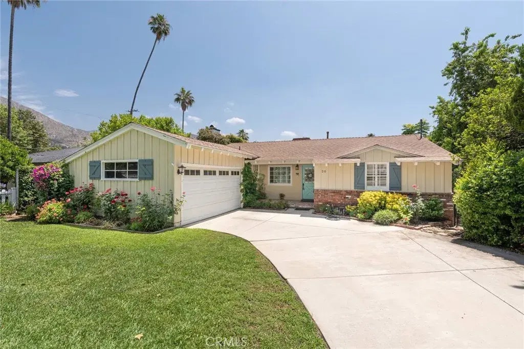 The interior of this charming home was recently painted and refreshed for its new owners and with hardwood floors, an updated kitchen, this 2-bedroom, 2-bathroom home is not far from the downtown area of Sierra Madre. In addition to the granite counters and stainless-steel appliances, the kitchen features an eat-in nook, access to the side yard and is adjacent to a dining area with views and access to the backyard. The living room features a brick gas fireplace and large built-in cabinets for displaying items plus storage. The main bedroom, with 2 closets and access to the backyard, has its own attached bathroom. The 2nd bedroom is near the hallway bathroom with walk-in tub/shower. The terraced backyard starts with a large partially covered patio for entertaining complete with brick fireplace and built in BBQ. The 2nd tier is your own private putting green and the lower tier is a place to just relax in the shade of the trees. A 2-car garage, central air and heat, this home is move-in ready.