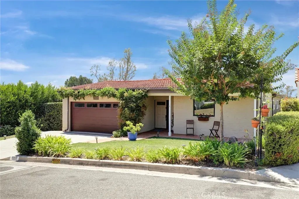 Beautiful, single-level ranch home in Fullerton's highly sought-after Hillcrest Park neighborhood! With stunning curb appeal, the spacious 3 bed, 2 bath home boasts a light-filled living room with vaulted open-beam ceiling, a brick fireplace, dual-paned custom wood windows and beautiful flooring throughout. The updated and bright kitchen has a large tile counter, newer appliances and plenty of cabinets for storage. Full bath is located in the hallway between the two guest bedrooms, each with dual-pane windows and closets providing great storage space. Well-sized primary bedroom with floor-to-ceiling sliding picture windows showing off city lights and seasonal sunset views. Primary bedroom has a large, walk-in closet and ensuite bath featuring a tile shower and dual sinks. Newer A/C unit keeps the home cool especially on these warm days. When you're running your A/C, the solar panels will keep your electric bill at a minimum. The living room windows look out to a large covered courtyard that leads to a peaceful grass area with large Meyer lemon, lime and fig trees. You'll feel the good vibes from the moment you enter the front door. Welcome home!