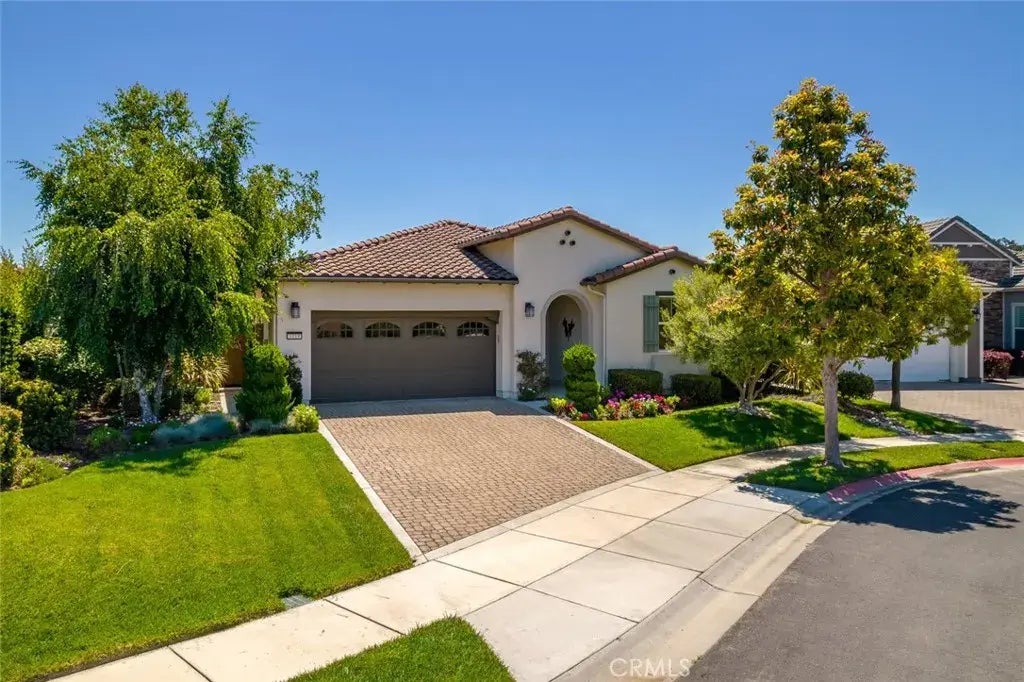 Resort living begins in this exquisite Spanish-style Nice floor-plan home, beautifully situated on a very desirable cul-de-sac with a magnificent birds-eye view of golf course and lake. This move-in ready 1,945 sq. ft. home built in 2014 offers 2 bedrooms, 2 full bathrooms, plus a den/office and is packed with designer upgrades including a custom front door, gorgeous hand scraped engineered wood floors throughout, striking Sandstone countertops, custom ceiling fans, and not one, but two rolling walls of glass which open to the back patio for quintessential indoor/outdoor entertaining. The orientation of the backyard offers protection from the coastal wind to make dining Al Fresco an option year round. Enter the gallery hallway and head toward the culinary kitchen - its the hub of the home - youll love the white cabinetry, Sandstone countertops and island, tile backsplash, stainless steel appliances, including a 5-burner cooktop and a walk-in pantry - its a chefs dream! Around the corner is the coveted SmartSpace, designed for optimum organization with two built-in desks, storage cabinets, laundry and sink. Across from the kitchen is a super comfortable living room with a spacious den next door, and a dining room with loads of natural light and incredible views. Head outside the rolling walls of glass to the covered patio - its the perfect spot to relax and gather with friends. The patio is surrounded by gorgeous, lush landscaping which frames the incredible golf course and lake views, and features a built-in gas fire pit which is sure to be your go-to spot in the evenings.