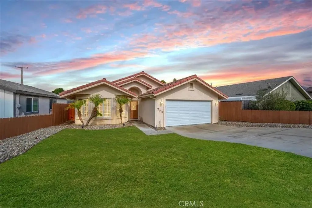 Presenting 773 Nice Avenue in Grover Beach on the Central Coast of California. Just a few blocks away from the Pacific ocean and beach access! This single level home was built in 2005 and is move in ready with the interior and exterior has been highly up kept along with offering clean pest and home inspection reports. It is a 3 bedrooms and 2 bath, with 1844 square feet of living space and sits on a 6625 square foot lot. It has double pane windows throughout and a 2 garage garage of which the door is only 3 years old. The Spanish tile roof isn't even at it's predicted half life yet. The front yard is landscaped with lush green grass with the backyard offering drought tolerant landscaping with 2 planter boxes built last year, and a drip system. Upon entering the home, you will see an open floor plan, first being greeted by the spacious living room offering 4 large windows pouring in lots of natural lighting. Off to the right is the kitchen, bar space and dining room with the dining room having its own gas fireplace and backyard access through the sliding glass door. The kitchen counters and cabinetry are in phenomenal shape. High vaulted ceilings run through out the living room, kitchen and dining room. The rest of the home offers 2 guest suites that share a full bathroom with it own tub. Lastly the spacious primary bedroom which also has vaulted ceilings, a full bathtub with a separate shower, double vanity sinks and access to the backyard through the sliding glass door. All of the appliances in the home are less than 5 years old, including an LG washer and dryer, Whirlpool