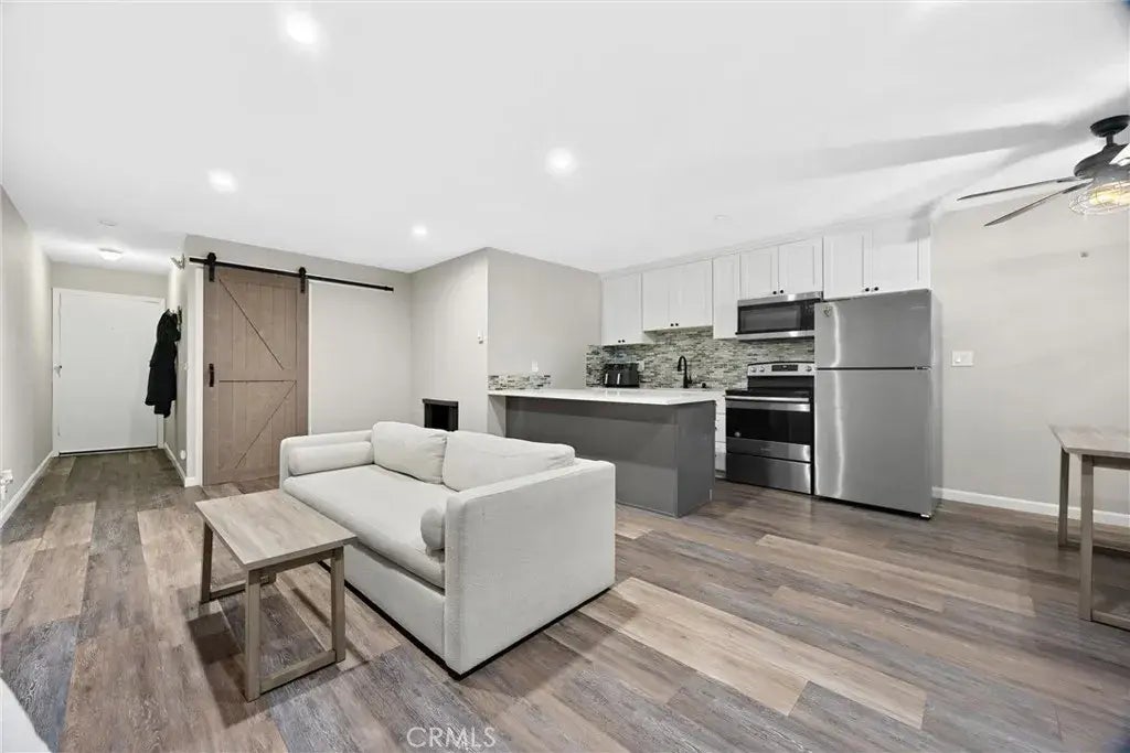 Experience the vibrant lifestyle of city living in the heart of Brentwood, only a short distance from Santa Monica. This contemporary condominium is in pristine, move-in ready condition. The open-concept living area boasts features such as luxury vinyl plank flooring, elegant quartz countertops, a ceiling fan for added comfort, and a stylish barn door that separates the bedroom suite. Designer shades enhance the aesthetic while providing privacy. Step out onto the balcony, which seamlessly integrates with the living space, allowing for an abundance of natural light. Additionally, residents can take pleasure in the community's heated pool and spa, perfect for relaxation and leisure. The property also features a private lobby entrance, providing an added layer of exclusivity and comfort. Take advantage of the scenic surroundings by biking or strolling to an array of nearby shops and restaurants.
