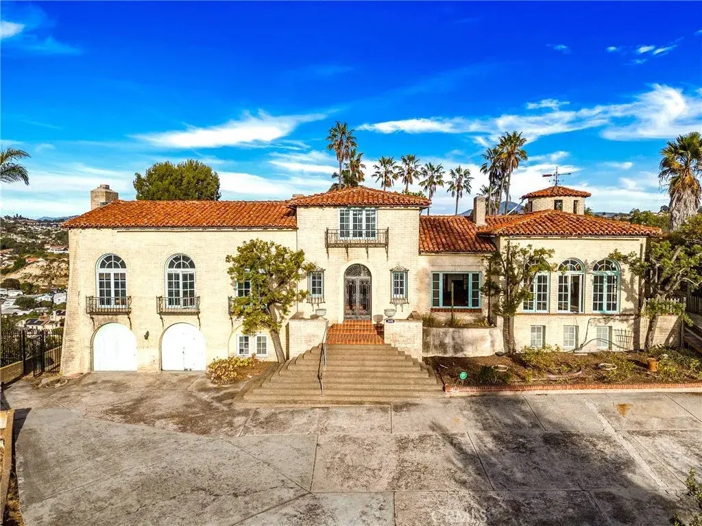 The Collins-Wellington Estate, an architectural gem in San Diego, presents a Spanish-Revival Castle built in 1928 by H.A. Collins. Nestled atop a private hill amidst a sprawling 8 acres of developable land, this estate offers a rare combination of seclusion, grandeur, and historical significance. It is listed on the Historic Register and benefits from huge property tax savings under the Mills Act. This 5,766 square foot mansion features intricate old-world craftsmanship, including high beam ceilings, inlaid onyx floors, hand-painted ceiling designs, and oak flooring with peg and bowtie detailing. The design boasts genuine Spanish Castle motifs, with repeating arches and wrought iron details that harmonize throughout the castle. The residence includes four bedrooms, each with en-suite baths, and ample space for sitting areas or home offices. A double foyer with stone castle walls, gold-gilded ceilings, and a wrought iron staircase leads to a private upstairs loft. The grand 35 x 25-foot ballroom/living room, with its 18-foot high cathedral ceiling and balcony, once hosted live musicians for dancers below. A spacious 35 x 20-foot dining room with inlaid onyx floor, and an updated kitchen with a granite island, enable grand-scale entertaining. The sunny breakfast nook sits below the castles tower, and a massive 10-car garage offers extensive storage and parking. Outside, the expansive grounds provide ample space for relaxation and entertainment, including a huge sheltered inner courtyard, with potential for additional structures such as a pool or ADU. The hilltop estate comman