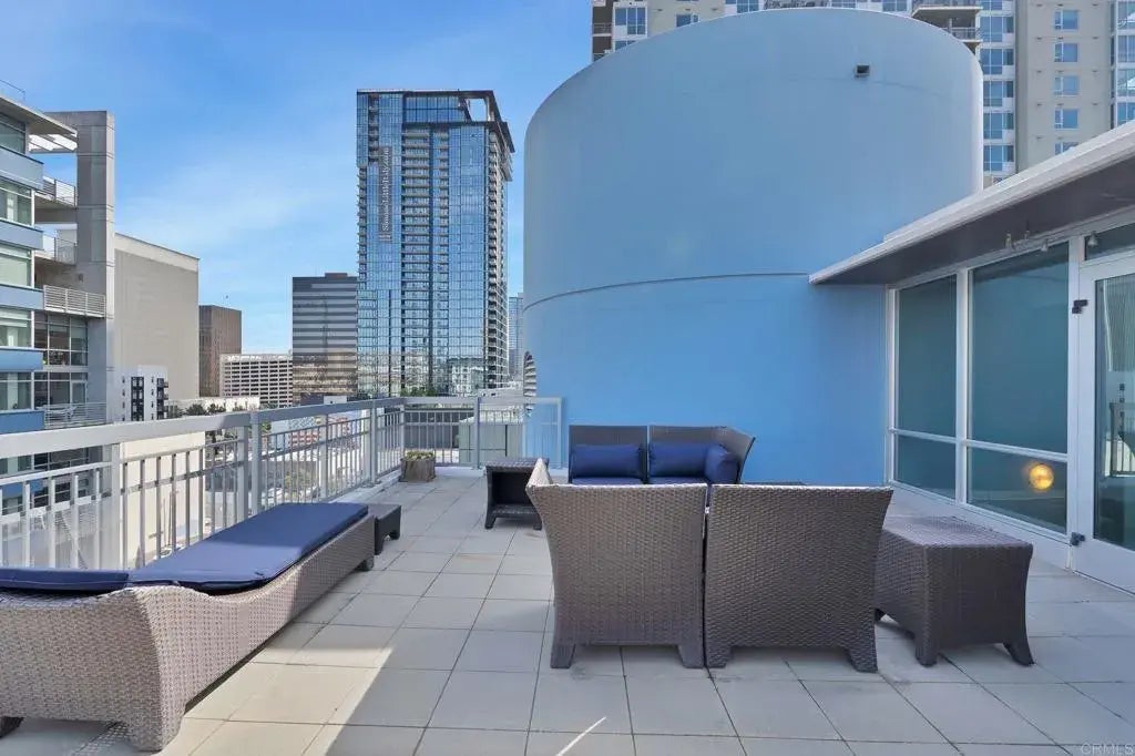 Private rooftop patio in Little Italy! Come see this unique 2 bedroom 2 bath plus den top floor unit at La Vita condos (mid-rise building on Union Street). Split bedrooms downstairs with a balcony. Upstairs is a loft area perfect for a home office and access to your huge private terrace with outdoor furniture. Ideal for entertaining and enjoying San Diego's beautiful weather. Two side-by-side parking spaces on P1. Walk to everything! Farmers Market, the waterfront. Tons of great bars and restaurants close by. La Vita condos feature a pool, hot tub, fitness center, and billiards room.