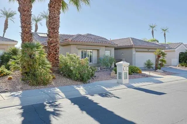 Beautiful "Morocco" floor plan with 3 bedrooms/ 3 Baths and den which includes a standalone Casita! This home is located in the award winning Sun City Palm Desert 55+Active Community. Gated 24 hour security. Upgrades of Over 230K in the last 2 years which includes, PAID Solar that was just installed in 2024-31 panels and a large battery that runs off the grid when needed, Patio covers in the backyard with misters and patio cover in the front courtyard going from the house to the casita. New Pool and Spa was installed in 2022 with 3 sheer descents, waterfall, and electronic pool app. BUT WAIT there is more-Back yard was completely redone with new decking, turf, fencing, and plants all in 2023. The inside of the house boasts high ceiling, crown molding, Shutters throughout, tile floor, large kitchen with newer appliances, sizable windows over looking award winning golf course! Need some rental income or place for family, the casita would be perfect with its own AC and a separate entrance. HOA is one of the lowest around and includes cable and wifi. The Sun City community has 3 restaurants,2 pro-shops, 3 clubhouses, 4 out door pools, 1 indoor pool, 2 fenced dog parks, 2 fitness centers, 2 Championship golf courses, bocce ball, pickle ball, tennis, bar, billiards and much more!