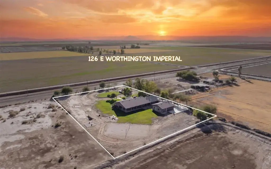 Welcome to an extraordinary 2.5-acre estate in the heart of Imperial, California. This property is a true sanctuary, offering a luxurious main house, a versatile ADU, and a wealth of outdoor amenities designed for relaxation and recreation. Step into the main house and be greeted by 3,041 square feet of thoughtfully designed living space. The open floor plan effortlessly connects the formal dining room, family room, and living room, creating a perfect flow for entertaining. High 10-foot ceilings and plantation shutters add elegance, while a gas fireplace in the family room provides warmth and charm. Every room features a ceiling fan for comfort, and the entire home is wired for surround sound, ensuring an immersive living experience. The heart of this home is its gourmet kitchen. Granite countertops, a large island with a sink, and premium appliances, including a wine fridge, trash compactor, and convection oven, make this space as functional as it is beautiful. The walk-in pantry provides ample storage, while the dual ovens ensure you are ready to host any occasion. The primary bedroom is a true retreat, complete with a walk-in closet, additional double closets, and an ensuite bathroom featuring a soaking tub, separate shower, private toilet, and double sink vanity. The remaining bedrooms are equally inviting, and the home's office offers the perfect space for remote work or quiet reflection. An indoor laundry room with plenty of storage and a utility sink adds convenience to your daily routine. Outside, the property transforms into an entertainer's paradise. The extensive