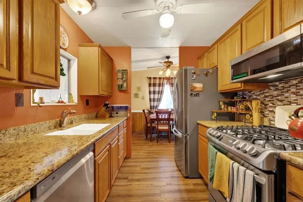 Welcome to this charming and private 2-bedroom, 2-bathroom home, located at the end of a quiet street in Santee Mobile Estates in the heart of Santee. Offering a peaceful retreat, this property features a beautiful garden area with a serene outdoor seating space, perfect for relaxing or entertaining. A convenient shed provides additional storage, and two dedicated parking spaces add to the home's ease of living. The bright and inviting galley kitchen claims elegant granite countertops and stainless steel appliances, all of which convey with the home. The spacious living room is highlighted by newer vinyl plank flooring and a modern mini-split-system air conditioning unit, ensuring comfort year-round. This wonderful home additionally features an amazing California room which may be used as an additional bedroom, office, media room, storage room, entertainment room, or even a crafts room-you name it. This home comes with a Wood Destroying Pest clearance and rodent barrier for added peace of mind. Located in a rent-controlled community, residents enjoy a range of amenities, including a clubhouse with a kitchen and internet, a heated swimming pool, a car wash station, community laundry, and RV storage. Ideally located near restaurants, shopping, and Costco, this home offers convenience and accessibility to everything you need. This is a fantastic value in a well-maintained community with space rent at just $638.95. (Includes water, sewer, trash)