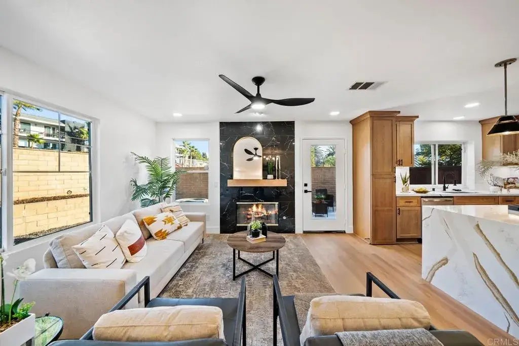 This beautiful 3-bed, 2.5-bath home spans 1,460 sqft and features a sleek, modern design with an open-concept layout. The living area boasts beautiful wood flooring, a sleek fireplace with a dark tile accent, and large windows that flood the space with natural light. The kitchen includes light wood cabinetry, a large island with striking marble countertops, and contemporary lighting. The master bathroom is luxurious, with dual vanities, a large walk-in shower, and modern fixtures. The home offers bright and spacious living spaces with high-end finishes throughout.