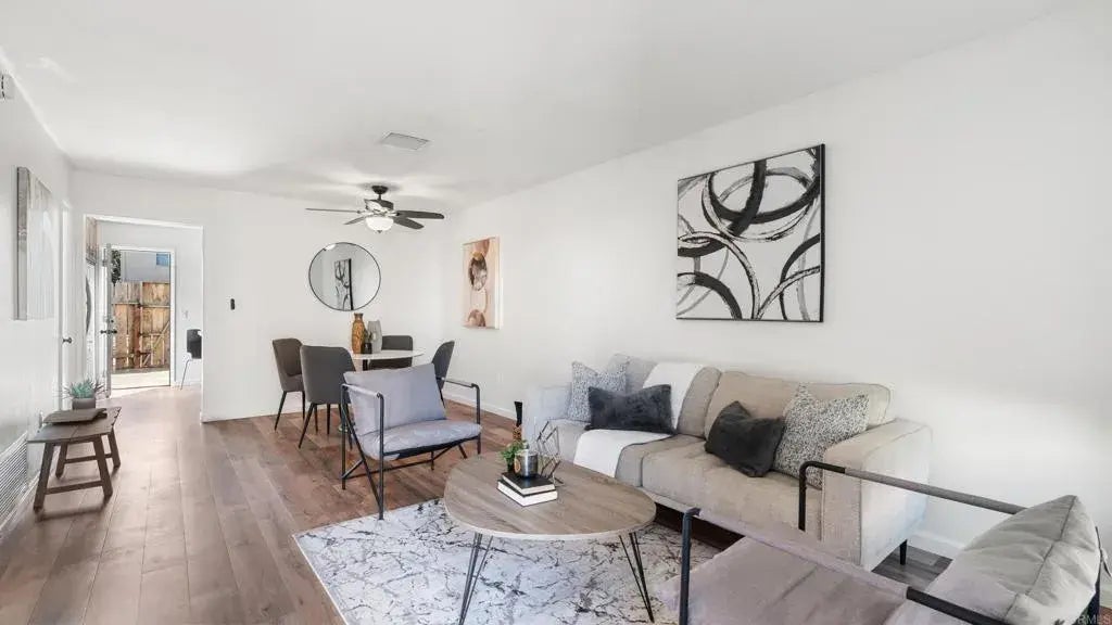 Welcome to this delightful 2-bedroom, 1.5-bathroom townhome offering 1,024 square feet of comfortable living space. Nestled in the heart of El Cajon, this residence combines modern amenities with a warm and inviting atmosphere. The open-concept living and dining area boasts hardwood flooring, providing a seamless flow for entertaining and daily living. Equipped with essential appliances including a refrigerator, dishwasher, and range/oven, the kitchen offers ample cabinetry and counter space for culinary enthusiasts. Both bedrooms are located on the upper level, featuring generous closet space and natural light. The Primary bedroom includes a private balcony, perfect for morning coffee or evening relaxation. The full bathroom upstairs is complemented by a convenient half-bath on the main level, both thoughtfully designed for functionality. Enjoy the convenience of a full-sized washer and dryer located within the kitchen area.? Situated in a well-maintained community, this townhome is conveniently located near shopping centers, dining options, and major freeways, providing easy access to all that El Cajon and the surrounding areas have to offer.? Don't miss the opportunity to make this charming townhome your own.
