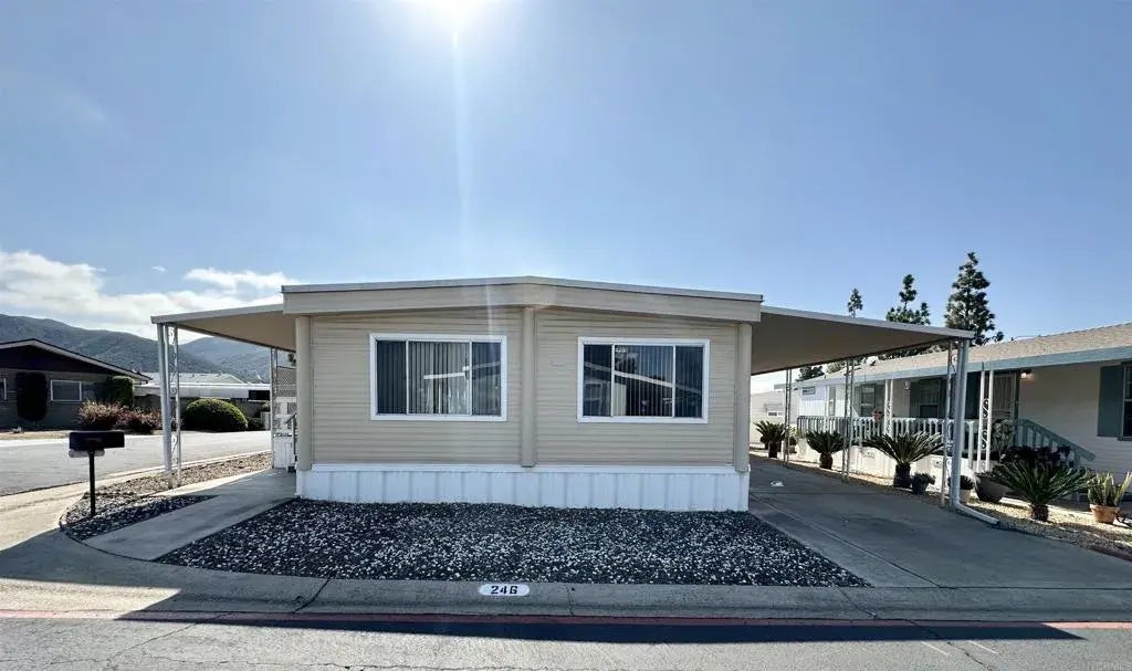Santee living at its finest! Large 2 bedroom 2 bath mobile home in the highly sought-after Meadowbrook mobile home park. This corner lot offers a view of the mountains and large sitting deck, perfect for relaxing, watching the sunset and enjoying morning coffee and afternoon tea. As one of the largest models in the park, it provides plenty of room for relaxation and personalization. Move in ready! Additional features include 2 sheds for extra storage, low maintenance landscaping and 2 car covered parking. Close enough to walk to the Clubhouse. Situated in the desirable gated Meadowbrook mobile home park youll enjoy easy access to local amenities such as sparkling pool, relaxing Jacuzzi, men and womens private sauna, billiards and game rooms, library and card room. The clubhouse itself is the hub of the community with its many activities, such as potlucks and bingo, crafting, yoga and game nights. Dont miss this incredible opportunity! Schedule a viewing today and see all that this charming Home has to offer!