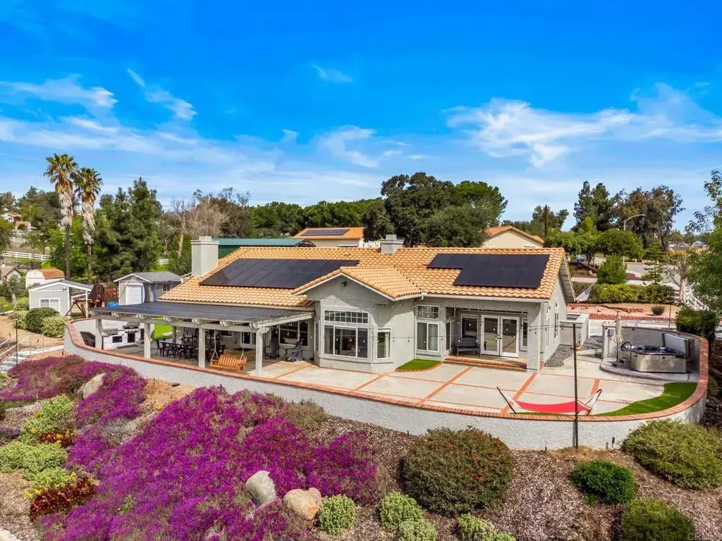 Nestled in Alpines serene beauty, this one-of-a-kind property blends luxury, functionality & sustainability. Featuring fully owned solar & two Tesla backup batteriesno SDG&E bill for the past two years and counting! The newly updated kitchen & baths impress even the most discerning buyers. The spacious primary suite boasts vaulted ceilings, a large en-suite, and breathtaking mountain views. Outdoor living shines with a covered patio, built-in BBQ, flat-top griddle, and bar seatingperfect for entertaining. Enjoy the finished she-shed/playhouse for a private escape or kids fun, plus an extra storage shed. Got big toys? The 26' x 48' metal building with remote gate access is perfect for boats, trailers & gear. Upgrades include a new spa, RV cleanouts, heat pump, water heater, central AC & whole-house fan for year-round comfort. The automated garden sprinkler system nourishes fruit trees like tangerine, lime, cherry, avocado, Meyer lemon & more! The meticulously landscaped grounds feature hardscape, turf, gravel & lush, mature foliage. This exceptional home showcases true pride of ownershipdont miss your chance to own a slice of Alpine paradise!