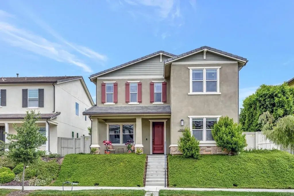 This beautiful Andalucia home in Harmony Grove Village offers a perfect blend of comfort, space, and functionality and features 5 bedrooms, 4 full bathrooms, 2 half bathrooms, an office, and rec room above the garage. It includes a first level bedroom & private bathroom, owned solar panels, tankless water heater, stacking door system, closet systems, built-in book shelves, California Room, lush landscaping, and a true three-car garage. The kitchen boasts upgraded flooring, white cabinets, a large island with seating, pendant lighting, full custom tile backsplash, under cabinet lighting, stainless steel appliances, double ovens, built-in trash receptacles, and a walk-in pantry. Sliding glass doors lead to the California Room for seamless indoor-outdoor living. The kitchen opens to a spacious dining area, which flows into the family room, creating an open-concept layout ideal for everyday living and entertaining. The primary suite features recessed lighting, a ceiling fan, and multiple windows. The en-suite bath offers two walk-in closets, dual sinks with under-cabinet storage, an oversized mirror, a soaking tub, a private toilet room, and a floor-to-ceiling tile walk-in shower with a bench and glass door. The downstairs features a private office with a built-in bookshelf and large windows. The family room includes a built-in entertainment area with lower cabinetry and expansive windows on both sides, filling the space with natural light. It flows seamlessly into a covered California Room, extending the living area outdoors. The stairway features recessed lighting and a windo