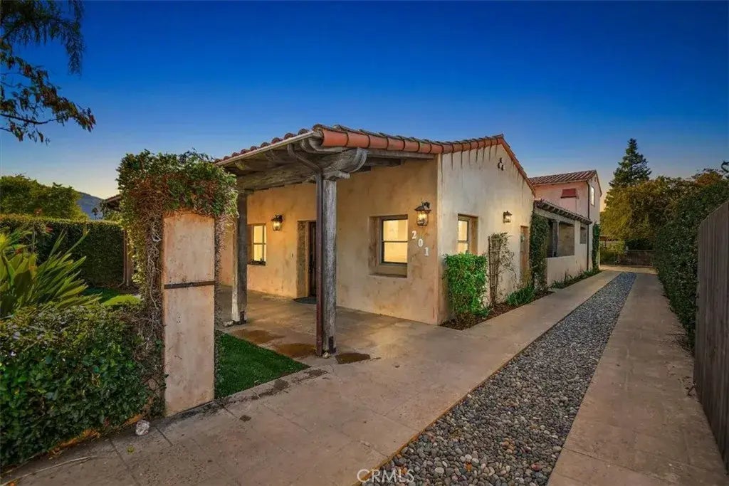 Nestled in the picturesque Ojai Valley, the city of Ojai, stands as a testament to natural beauty, cultural richness, and a serene way of life. Renowned for its idyllic charm, Ojai captivates visitors with its stunning landscapes and a community spirit. Embark on a journey of serenity with the exclusive privacy of this Ojai charming retreat. As you enter through the private gate into a lushly landscaped courtyard, you'll discover a luxurious Spanish-style home and an additional guest house, creating a distinctive and versatile living space. This captivating 2 bedroom, 2.5 bath main residence with 1bd 1ba guest house invites you to unwind by the living room fireplace or indulge your culinary passions in the gourmet kitchen featuring custom alder wood cabinetry and chiseled granite countertops and Life Source water filtration system. Beamed ceilings, new hardwood floors, and fresh paint contribute to the home's inviting ambiance. Ease of maintenance is found in the saltillo tile floors, while the spacious covered patio area beckons for entertaining with its built-in BBQ and stone fireplace, wired for your entertainment needs. A short walk leads you to restaurants, shops, and the picturesque Libbey Park, offering a perfect blend of convenience and seclusion. Each of the main house's spacious bedrooms features its own bath, complemented by a convenient powder room for guests. Behind the main house, the 1 bedroom, 1 bath guest house sits above the attached triple garage, providing privacy and stunning mountain views from its private patio. Benefit from ample parking and a trail