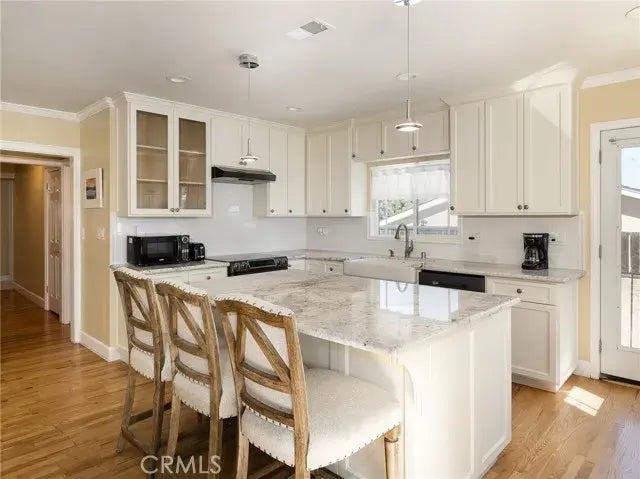Spacious upgraded home with incredible hard to find four car garage. Freshly painted and brand new kitchen with center Island and Samsung appliance package complete the culinary experience. located in the Award winning Palos Verdes school system. The single level home has peek a boo views of the harbor and city. The majority of the home has hardwood floors and the remaining bedrooms have newer carpet. Enjoy watching movies in the family room that opens to the dining area. The main bathroom has been remodeled to include a spacious walk in stone shower and custom cabinets with floor board mounted lighting. The rear four car garage is perfect for the additional projects or home office. The 8000 square foot lot has a large grassy rear gated yard, perfect for family gatherings. Additional upgrades include new electrical panel, air conditioning, dual paned windows and sliders, cozy fireplace in the bedroom, eco friendly designed front landscaping, crown molding, new front entry door, recessed lighting, French doors and new garage doors. Steps away you have access to the Miraleste hiking trails.