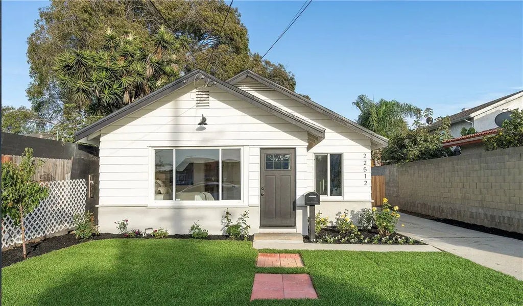 Welcome to 22512 Meyler Street, a fully renovated 3 bed, 1 bath, home located in a sought-after neighborhood. This beautiful property features new appliances, flooring, paint, lighting, and newly renovated kitchen and bathroom, offering a fresh and updated feel throughout. Upon entry, you're greeted by a bright living space with large windows, that flows into the kitchen with all new appliances, center island with breakfast bar, dining area and ample storage space in new cabinetry. Big opportunities with the 5,800 sq ft lot, providing an oversized backyard perfect for outdoor entertaining, tradesman work space or additional off-street parking of up to 10 cars. The long expansive driveway leads to a spacious 2-car garage equipped with a built-in storage area and high ceilings providing potential for an additional dwelling unit (ADU). Both the house and garage roofs have also recently been replaced. The redesigned landscaping adds curb appeal and creates a serene outdoor oasis with fruit trees and lush grass, ideal for gardening or enjoying sunny California days. With its convenient location near top-rated schools, parks, shopping, a short drive from local beaches and entertainment, 22512 Meyler Street presents a unique opportunity to live in convenience and style. This home is move-in ready and waiting for you to make it your own!