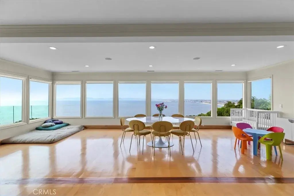 Situated on a premier street in one of the most coveted neighborhoods of Palos Verdes Estates, this Malaga Cove property promotes breathtaking panoramic views of the Pacific Ocean, sandy beaches, and the sparkling Queens Necklace all the way to the tip of Malibu. This residence boasts sophisticated living spaces meticulously designed for both comfort and style, with every detail exuding refined craftsmanship and superior quality. The showstopper is the wall of floor to ceiling windows looking out to the ocean from the living room, dining area, and kitchen. The open living room offers a fireplace surrounded by custom woodwork of beautiful built-ins and cabinetry. The gourmet kitchen is a chef's dream come true, equipped with state-of-the-art appliances, custom cabinetry, beautiful tile work, and a butchers block island. The dining area is off to the side for you to enjoy each meal with an awe inspiring view. Throughout the home, you will notice the superior woodwork with built-ins, cabinetry, doors, and bold trims custom to this home. One of the areas with beautiful woodwork is the office, blending functionality with timeless elegance to foster creativity and productivity. The entry level is the top floor, offering the master bedroom with an ensuite bathroom and freestanding tub, home office (can be the 4th bedroom), living room, dining area, balcony, kitchen, and direct access to the two-car garage. The lower level offers the den/family room, 2 bedrooms with ensuite bathrooms, the laundry area, and access to the terraced yard. The yard is a true retreat, offering two levels