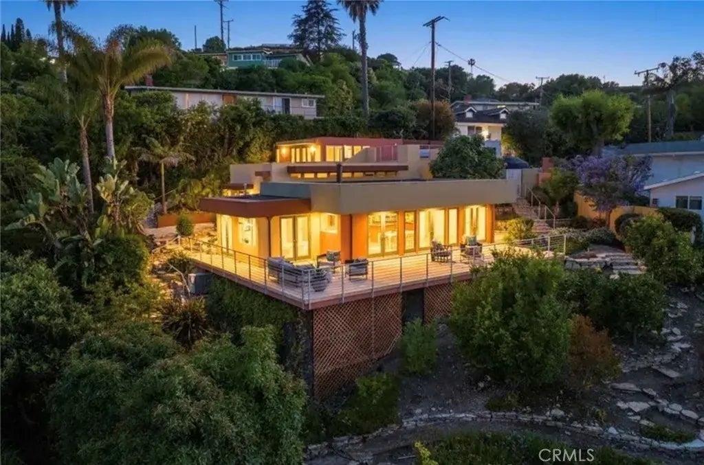 This stunning coastal retreat, located at the end of a private road, offers unparalleled privacy and breathtaking views. Behind a secure gate, you'll be welcomed by sweeping harbor vistas and a tranquil reflecting pond. The open-concept floor plan seamlessly integrates indoor and outdoor spaces, with expansive windows and doors framing the scenic surroundings. The massive deck is perfect for both relaxation and entertainment. The kitchen features modern cherry-toned cabinetry, granite countertops, and stainless appliances, including a new refrigerator. The stylish flooring, a combination of travertine and newly refinished solid maple hardwood, adds elegance and warmth. High ceilings, recessed lighting, and a cozy fireplace complete the inviting ambiance. The main bedroom is a luxurious retreat with a newly designed spa-like en-suite bathroom, including a soaking tub, double vanity, stall shower, and separate water closet. A spacious closet/dressing area adds convenience. From the main, access a beautiful flagstone patio where you can immerse yourself in the surrounding beauty. The property spans nearly an acre, with meandering walkways and lush landscaping, including fruit trees such as Eureka lemon, orange, loquat, avocado, fig, tangerine, and grapefruit. It is also equestrian-zoned, and has previously hosted horses. Originally built in 1958 and fully re-imagined in 2004, this home is the epitome of coastal living, combining elegance, opportunity, and tranquility. Photos are Virtually staged - property to be delivered unfurnished